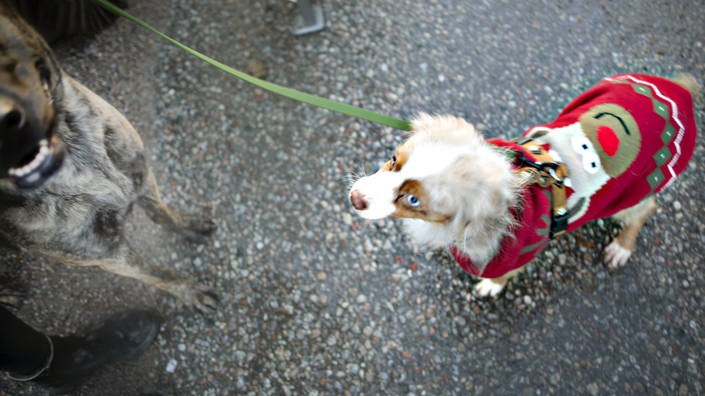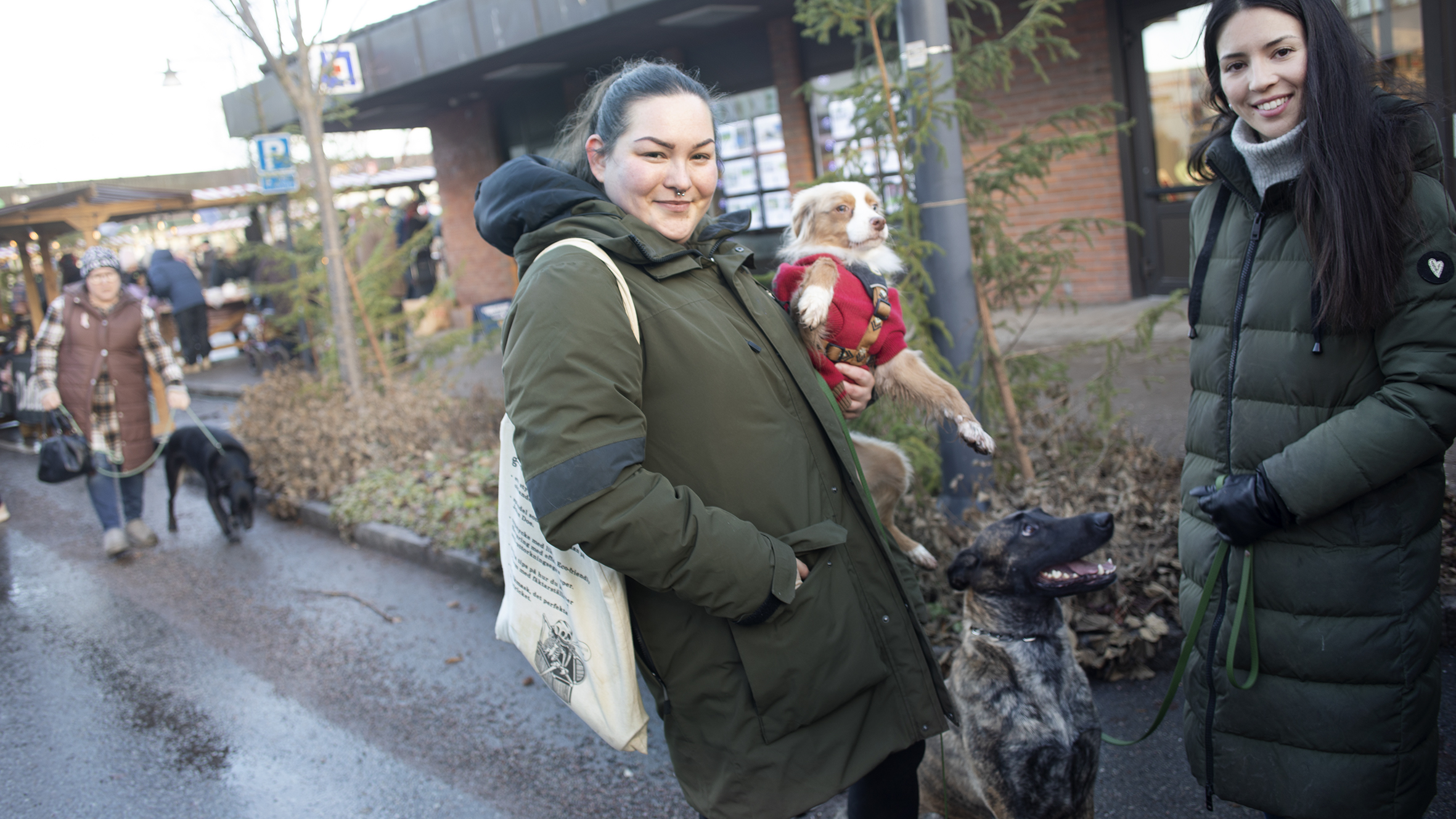 På marknaden syntes också många välklädda fyrbenta besökare. En av dem var hunden Silke, en Miniature american shepherd som, lite frusen efter valpning, bar en varm renen Rudolf-dräkt.