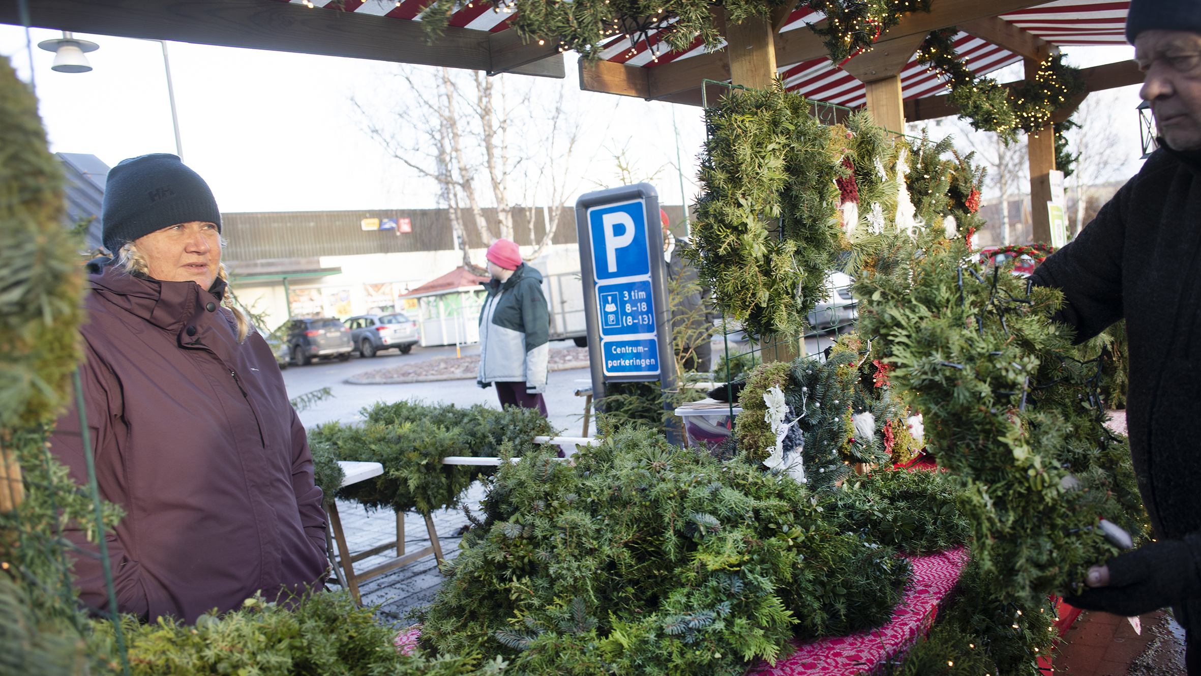 — Vi har ungefär tvåhundra kransar med oss idag, gjorda av blåbärs-, lingon-, en- och granris. Kransarna är storsäljarna! Många köper två, det är vanligt med dubbeldörrar här, berättar Maria Wikström, som varit med på julmarknaden i hela 19 år.