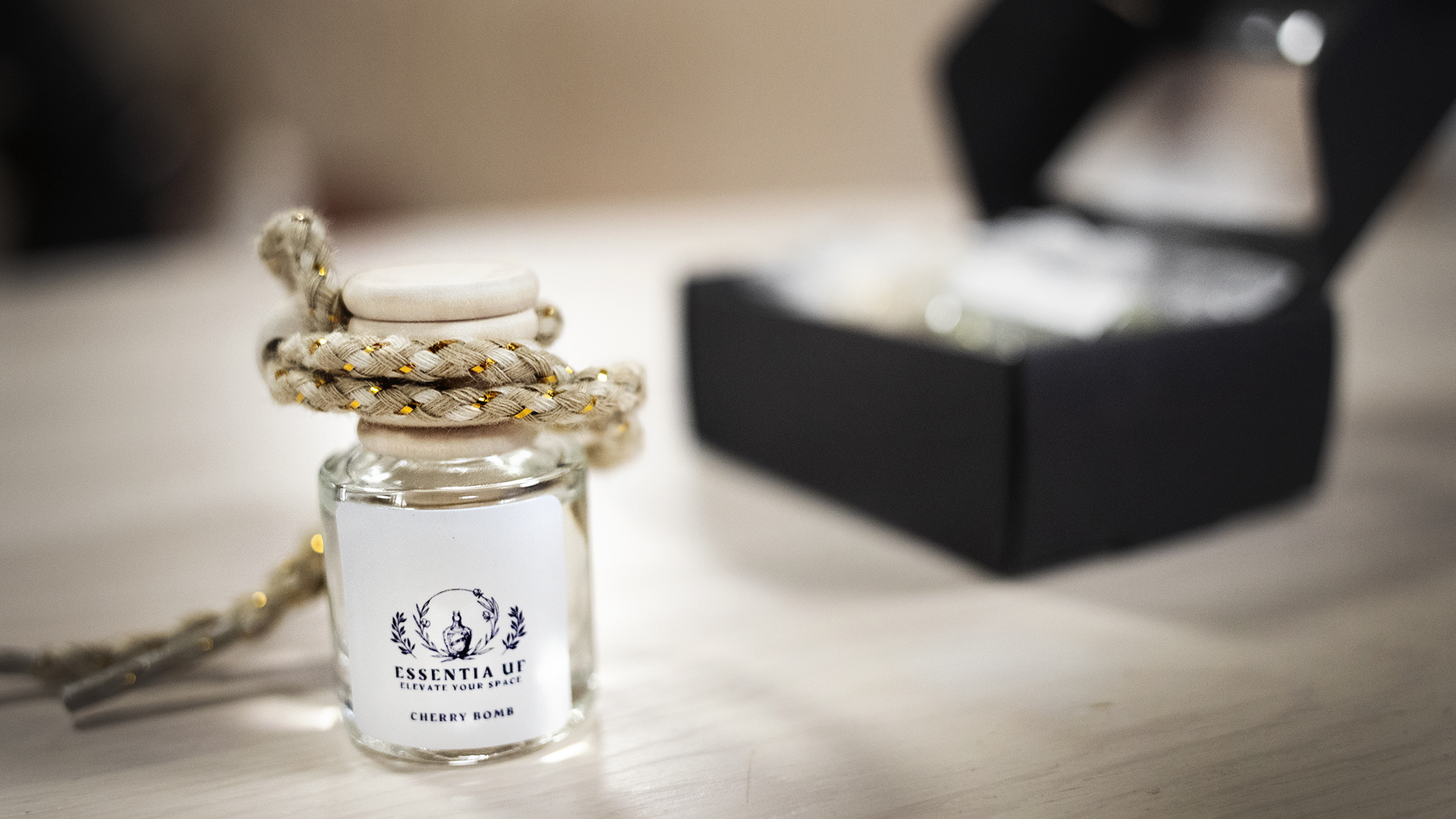 — Att få lära sig att driva företag och få en inblick i företagsvälden, på ett helt annat sätt än vad man får som anställd, konstaterar Essentia UF´s Liam Rickardsson och kollegan Aleksander Tallnäs håller med. Deras produkt är doftspridare i små glasflaskor med trälock, de har redan sålt 150 stycken och berättar om produkten:
