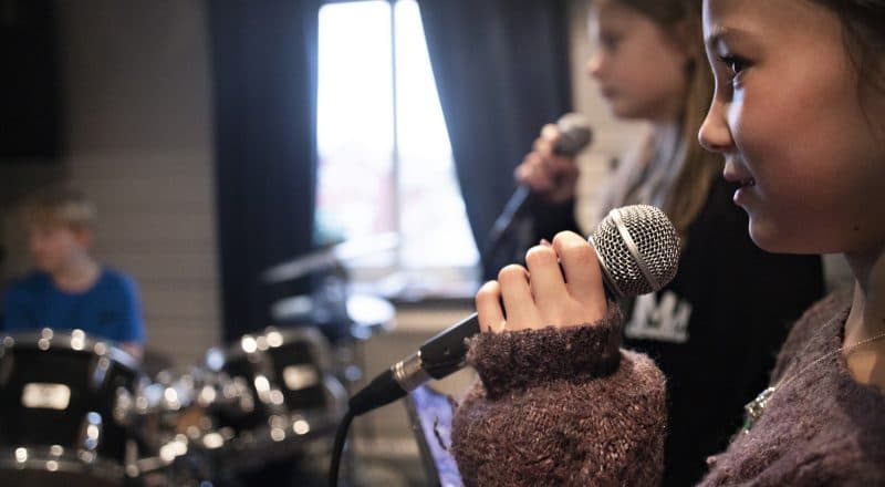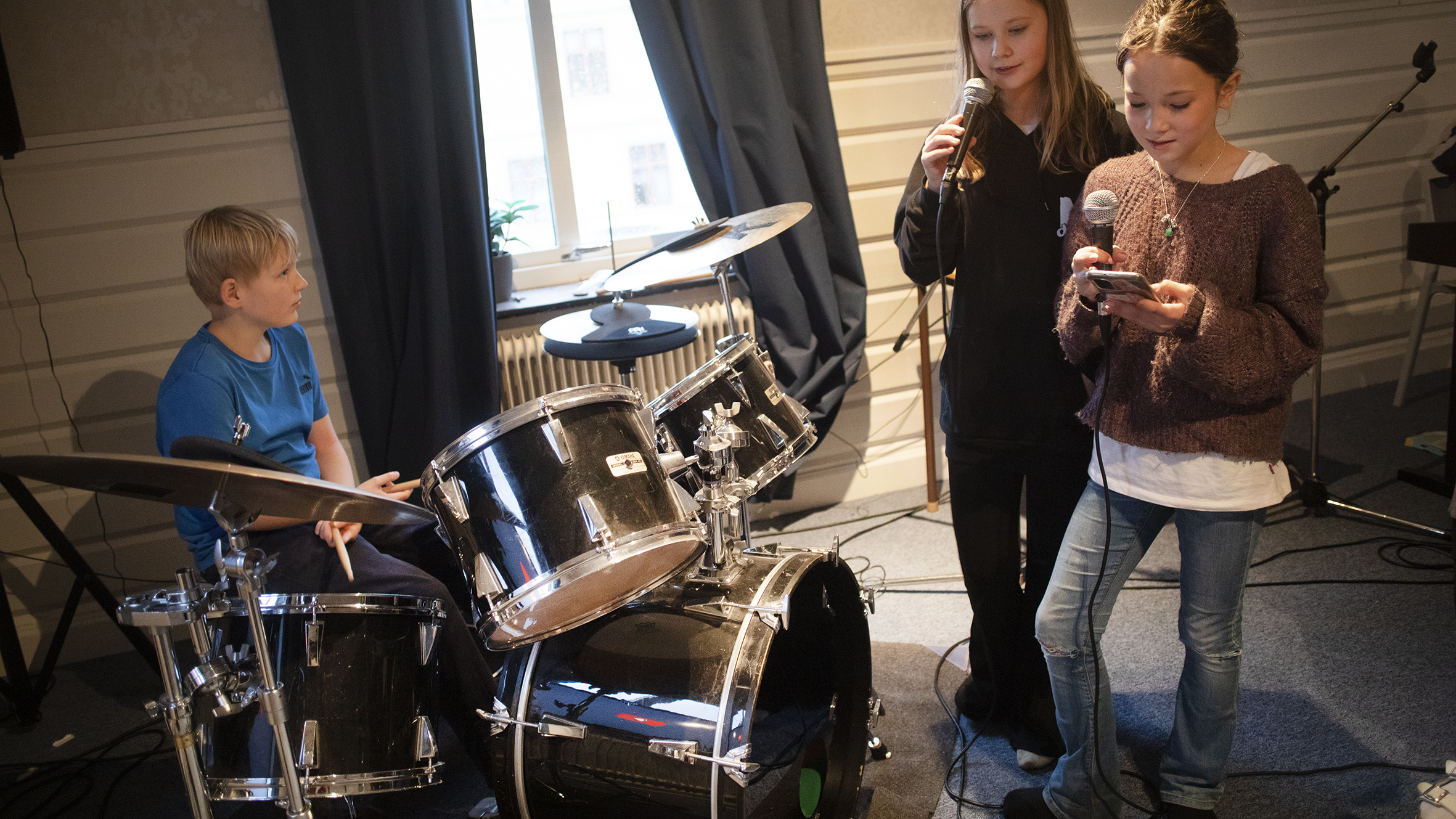 På övervåningen står redan två 11-åriga tjejer, Linnéa Möller Collin och Jocelyn Kimura, de letar efter låten ”Lovely” med Billie Eilish och Khalid, för att sjunga karaoke. Personalen hjälper till att logga in, koppla upp mikrofoner och högtalare. Benjamin sätter sig vid trumsättet – han tänker kompa när tjejerna sjunger.