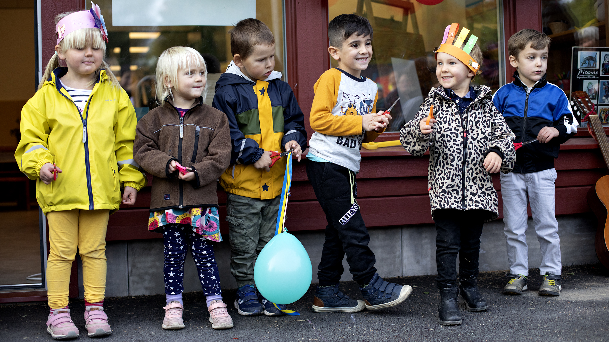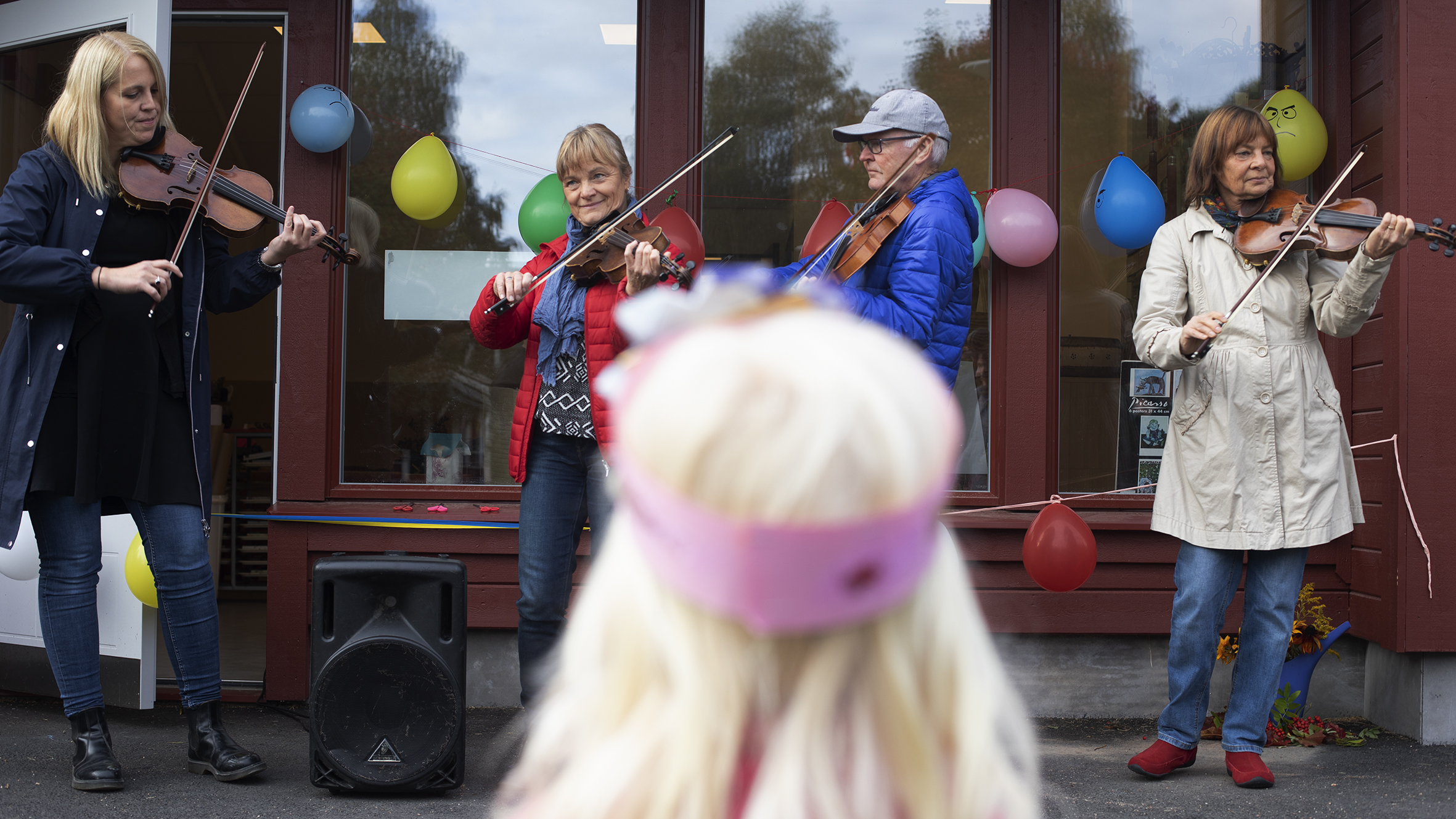 Mellan Leksands kyrka och Tegera arena ligger den nyrenoverade förskolan. De femtio barnen från avdelningarna Sjön, Skogen och Klippan och deras föräldrar har samlats för att fira.