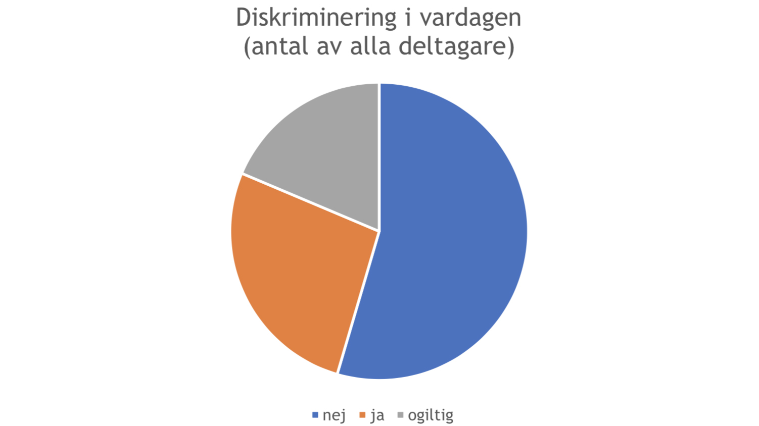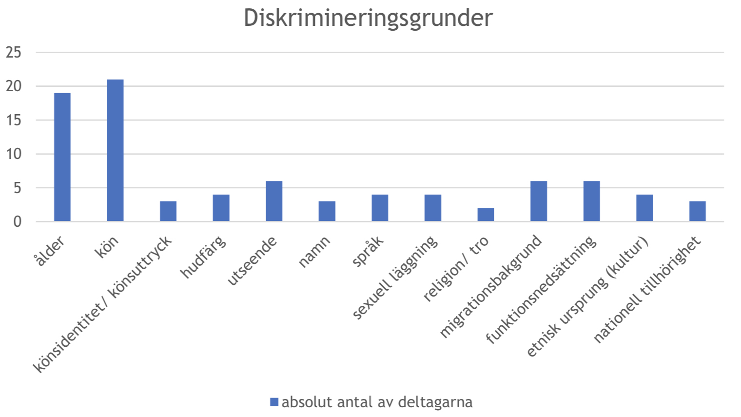 — Det var chockerande! Tjugosju procent av alla deltagare i undersökningen – alltså mer än en fjärdedel anger att de upplever diskriminering i vardagen. Deltagarna nämnde alla diskrimineringsgrunder när de skulle beskriva sina upplevelser, men två kategorier stack ut mer, nämligen kön och ålder. Antalet diskrimineringsupplevelser på fritiden är högre än på jobbet – även om det är ett tidsspann på dagen där deltagarna får bestämma själva hur de tillbringar det.