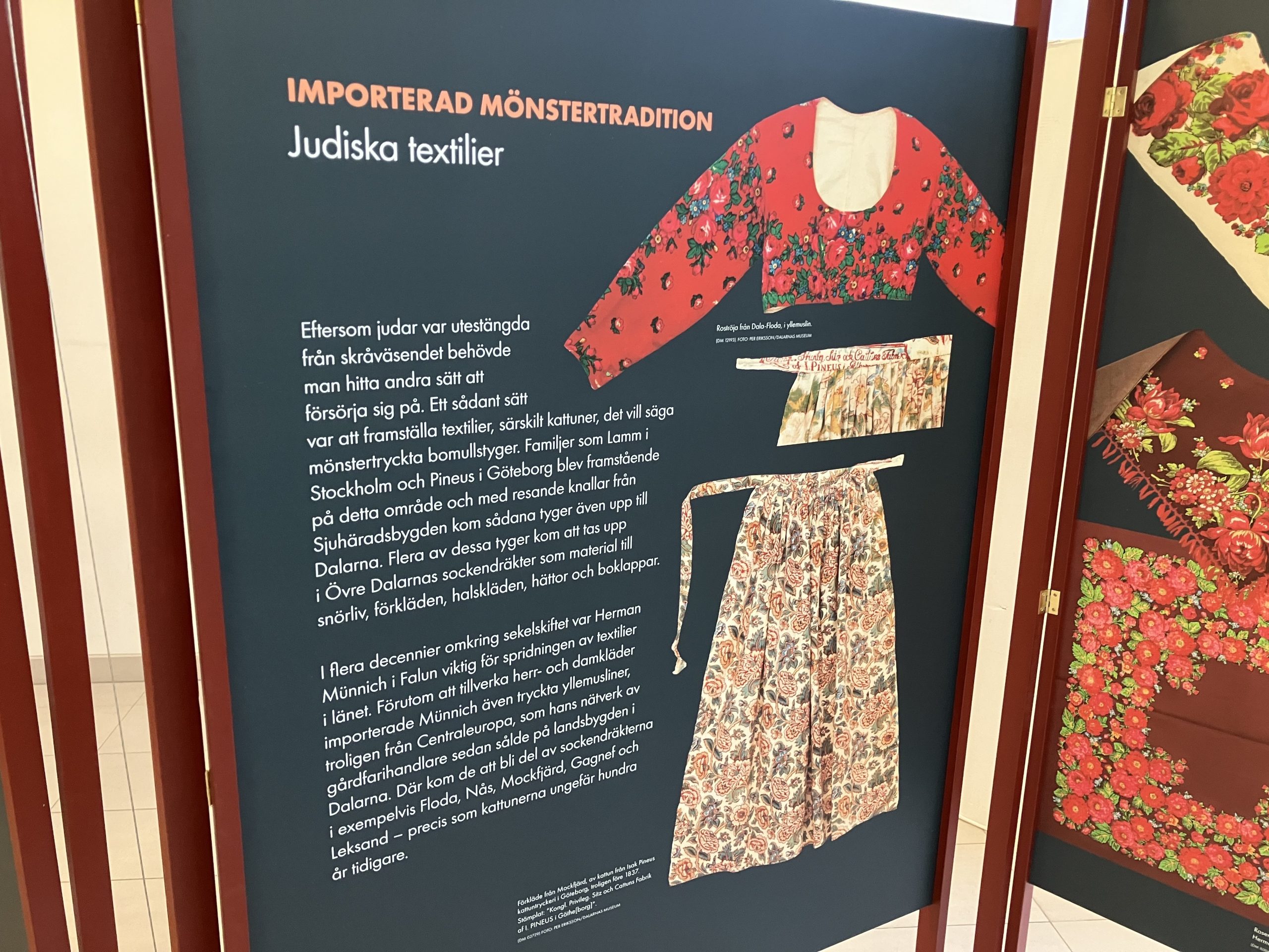 Utställningen visar också hur judiska influenser letat sig in i dalakulturen. Bland annat visas textilier från Mockfjärd.