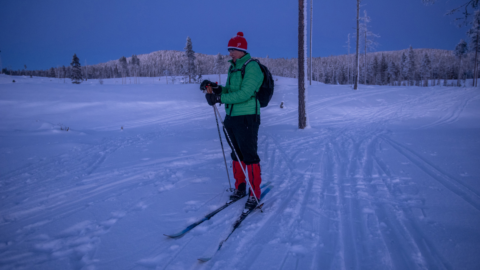 Det är en obeskrivlig känsla att få vistas i denna pärla i Limaskogarna, mitt emellan Malung och Sälen. Klockan har passerat 15 och det är dags att bege sig ner till bilen. Det finns dock en oro inom mig för hur jag ska klara av att åka nerför branten i en trång skog. Oron är befogad, vi kommer ännu en gång fel och åker helt utanför leden. Vi vet inte alls var vi är, fördelen med att åka vilse på ett berg är emellertid att man alltid kommer ner. Färden utför går i snigelfart, släpper man på så är risken stor att man åker in i ett träd eller ramlar och i värsta fall bryter benet. Vi ramlar båda två då och då. Vi hjälper varandra upp eftersom den djupa och lösa snön gör det extra svårt att resa sig upp. Är det så här det känns att ramla i kvicksand?