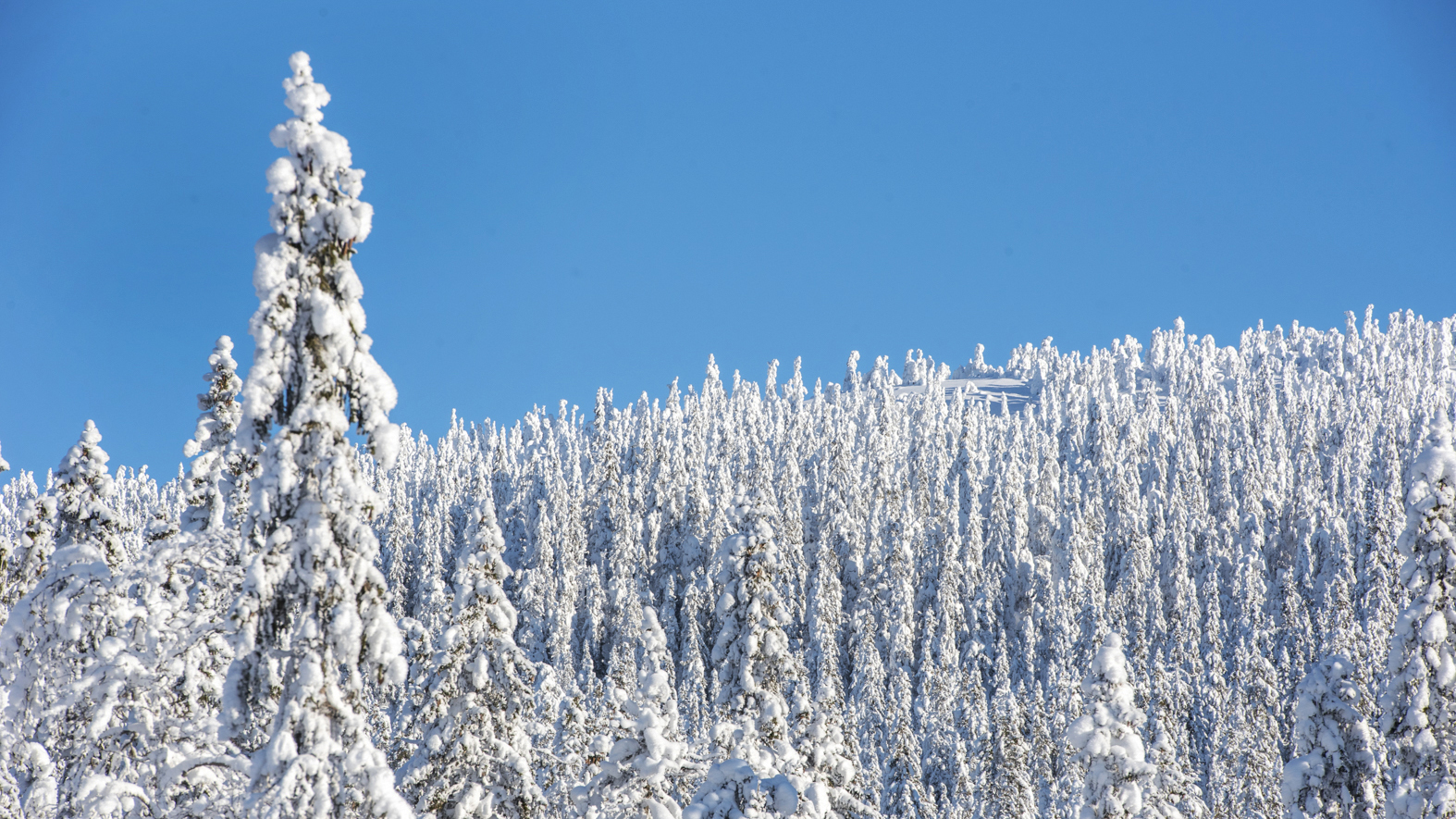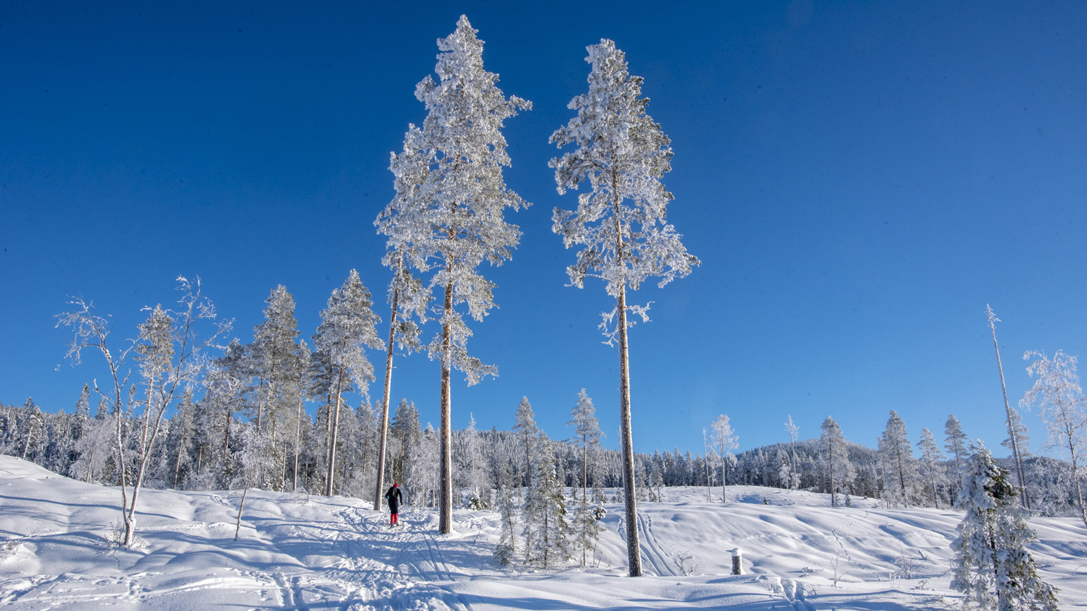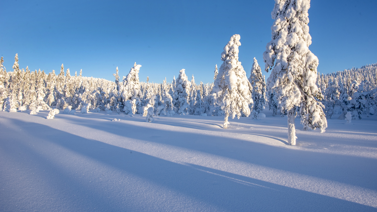 Solen går snart ner och vi gör en tur norrut. Vi behöver inte åka långt för att få se ännu ett sagolandskap i snö. Den lågt stående solen gör långa skuggor. Det är som att befinna sig i en annan värld.