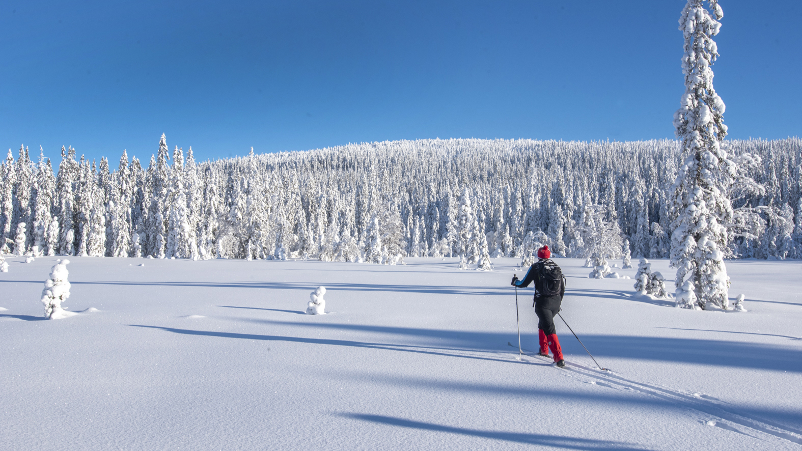 När vi kommit upp från den värsta branten blir det lättare skidåkning. Bratthols Karin Persson som också är med tycker det går bra. Med sin superkondition och vallningsfria skidor hade hon inga som helst problem att skida uppför det branta berget. Solen skiner vackert, dock inte i skogen som vi åker i. Där är det mestadels skugga. Vi åker på sommarleden som är svår att följa vintertid. Den djupa snön gör det svårtillgängligt. Vi följer skidspåret och plötsligt känner vi inte igen oss, vi hamnar ute på en myr. Vi kommer ut ur mörkret och får uppleva något helt makalöst vackert. Ett kritvitt landskap med snötyngda träd och en knallblå himmel samt åsynen av Storvarden. Det är så storslaget!