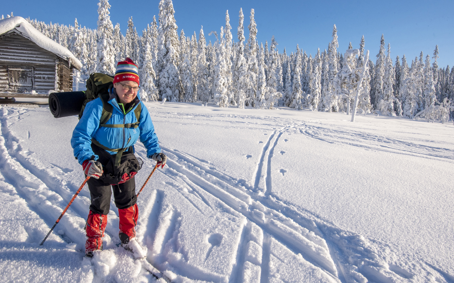 Turen på Gräsbricksleden börjar numera på ett kalhygge. Det är ingen rusning till Tandövala den här tiden på året. Därför blir vi glatt överraskade när vi ser flera skidspår. Vi följer spåren, efter en halv kilometer passerar vi gränsen till naturreservatet. Jag sätter på stighudarna på turskidorna inför den branta stigningen uppför. På grund av den starka kylan, som är omkring minus 20 grader, lossnar den ena stighuden efter ett tag. Klistret är för dåligt. Jag tar av den andra också och får förlita mig på den gröna fästvallan. Den ger dåligt fäste så det blir en kämpig stigning uppför på bakhala skidor. Med facit i hand var det dumt att inte stanna och valla på lite blått.