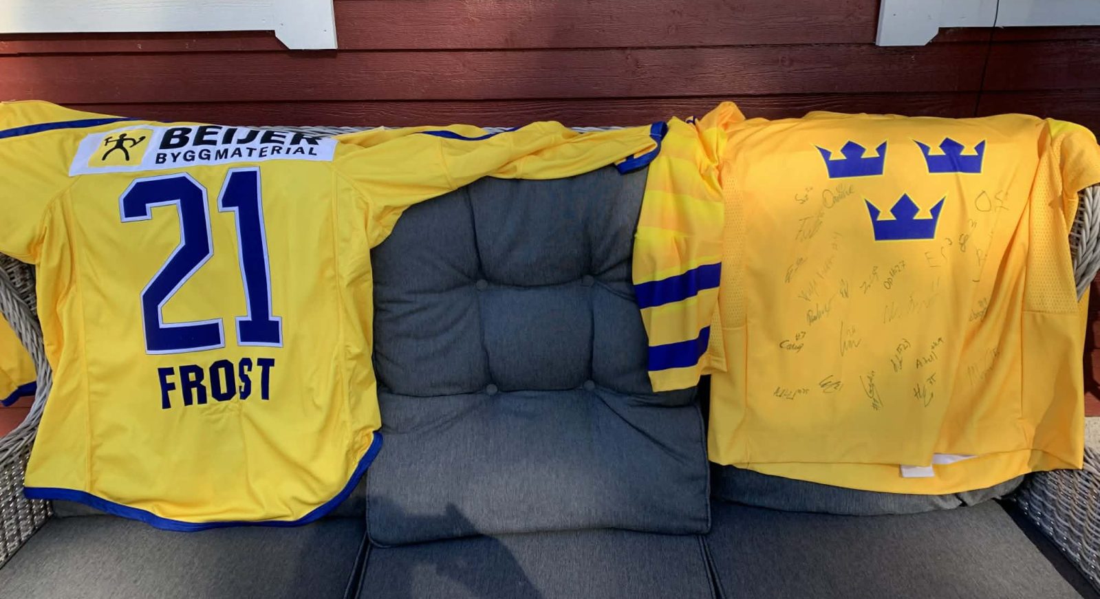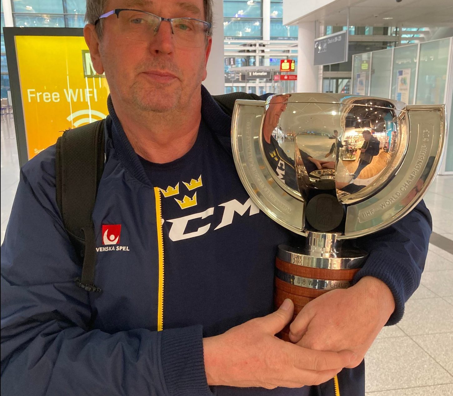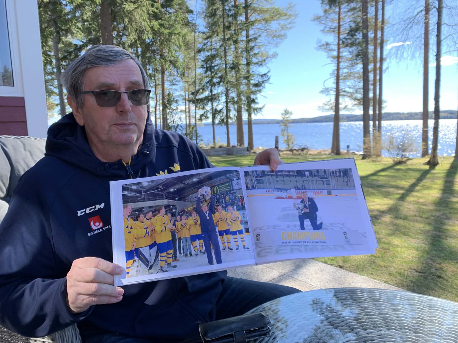 Totalt blev 21 säsonger som materialare för U16- och U18-landslagen. Han visar upp en landslagströja med nummer 21, hans namn på ryggen och alla spelare och ledares autografer från gänget som gick hela vägen. En av spelarna i guldlaget 2022 var Leo Carlsson, numera firad NHL-stjärna i Anaheim. Fler kända namn fanns med i guldtruppen.