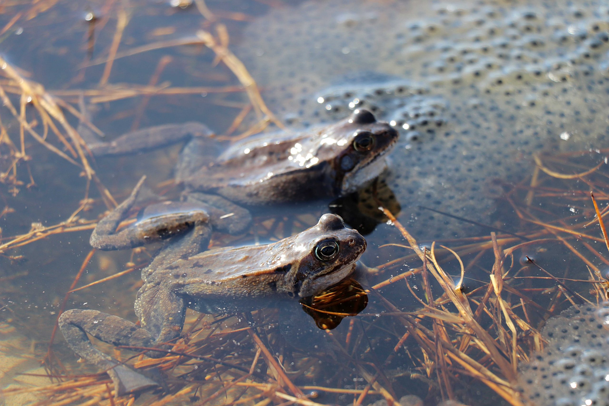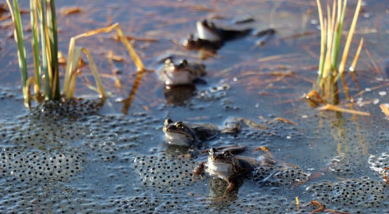 Det är två olika grodarter som rör sig i området, vanlig groda och åkergroda.
