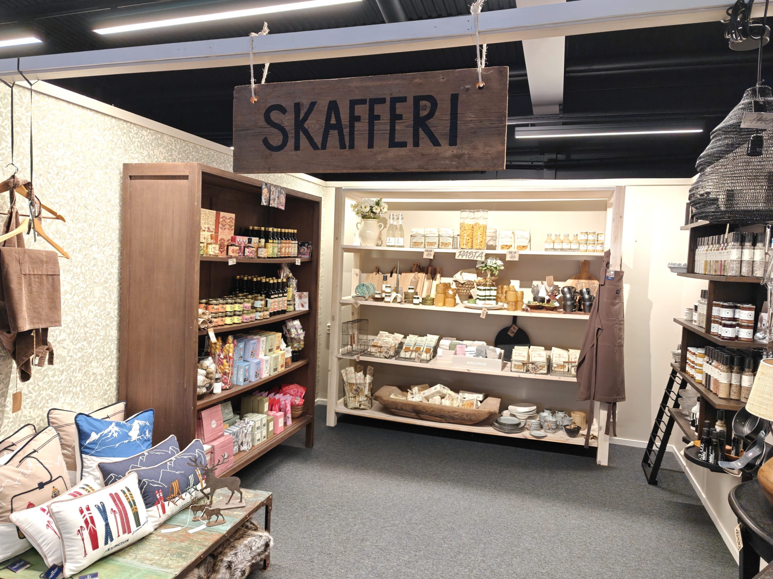 Butiken välkomnar kunden med lågmäld musik i högtalarna samt en hemtrevlig miljö. Soffor, hyllor, bord och attiraljer fyller JuTe Home. Dessutom finns en lekhörna och ett skafferi med varor från hela världen.