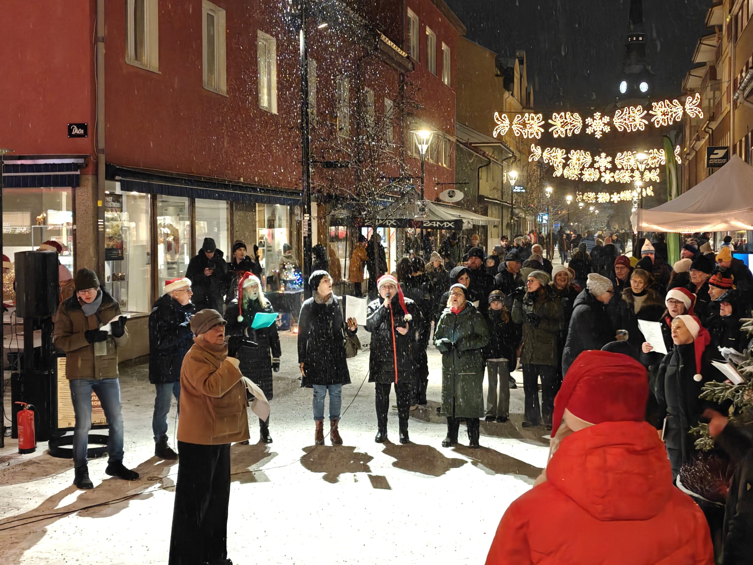 Med flingor som dalade ner från skyn infann sig julkänslan hos folkmassan när Mora hade julskyltning under söndagen. Den traditionella adventshelgen innehöll såväl utställare som sång och en uppskattad tomteparad.