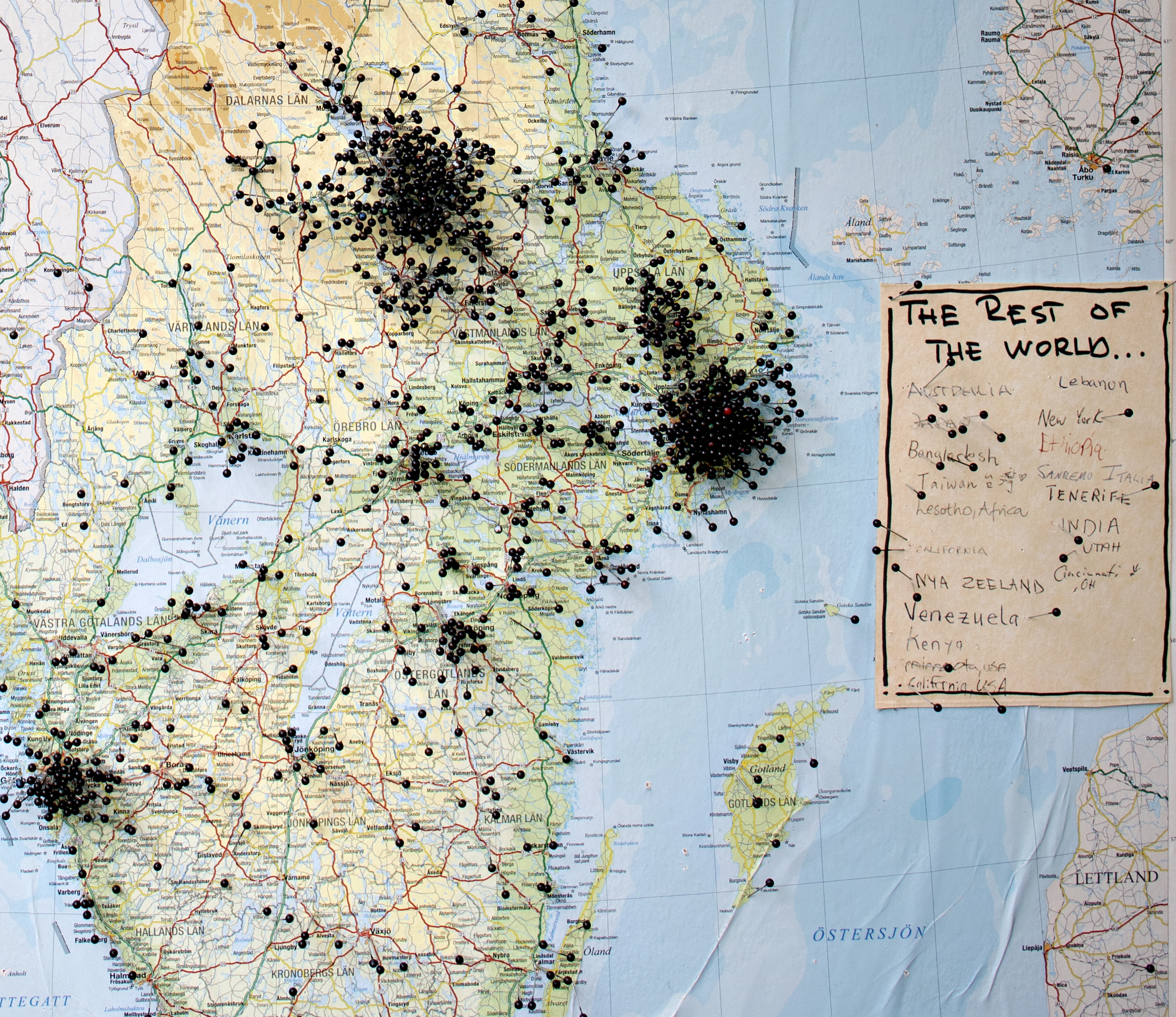Thomas visar den inramade Sverigekartan han satte upp efter midsommar i år. Ända sedan öppningen 2019 har man varit nyfiken på var alla gäster kom ifrån. Över tvåtusen nålar gick åt när några av gäster markerade ut sin hemort. Från Riksgränsen i norr till i Trelleborg i söder, ja och så resten av världen.
