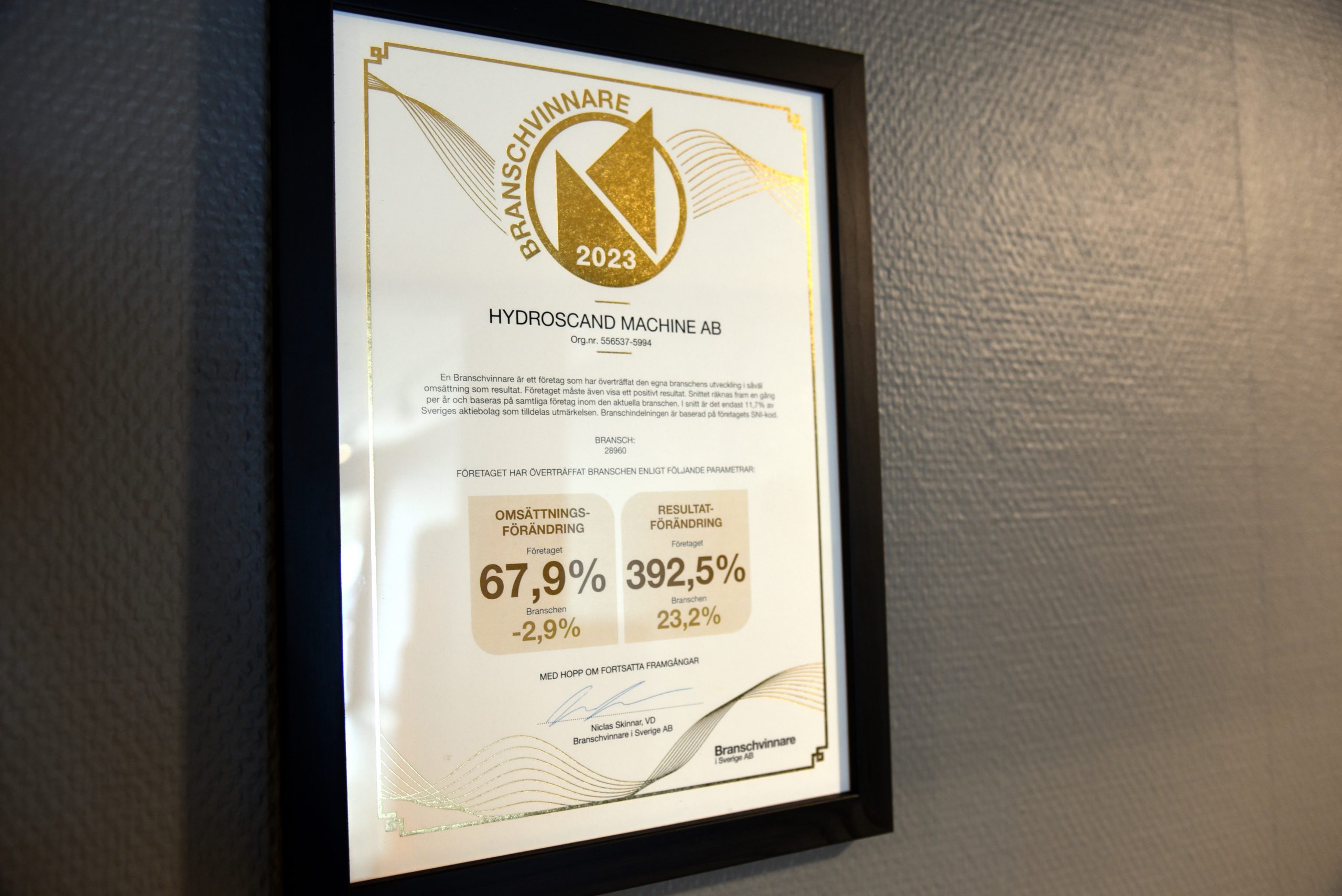 Hydroscand Machine AB i Säter har fått utmärkelsen Branschvinnare 2023. En branschvinnare är ett företag som har överträffat den egna branschens utveckling i såväl omsättning som resultat. Företaget måste även visa ett positivt resultat. Snittet räknas fram en gång per år och baseras på samtliga företag inom den aktuella branschen. I snitt är det endast 11,7 procent av Sveriges aktiebolag som tilldelas utmärkelsen. Branschindelningen är baserad på företagets SNI-kod.