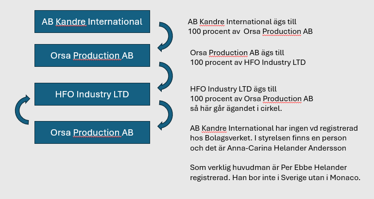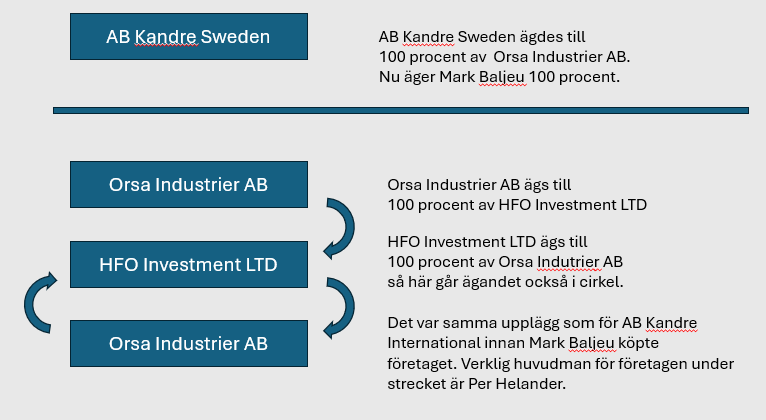Sammanfattningsvis är det två olika företag som det här gäller. AB Kandre International är det med stora skulder och som nu har begärts i konkurs av Skattemyndigheten. AB Kandre Sweden är det företag som inte har några skulder och som idag säljer toalettsitsarna och äger rättigheterna. Det företaget ägdes också tidigare av en koncern styrd av Per Helander och upplägget med en koncernstruktur med blandning av svenska och utländska bolag som i slutändan äger varandra var identisk. Men enligt Mark Baljeu är han idag ensam ägare och har som mål att bygga upp företaget. Dock inte med produktion i Orsa längre.