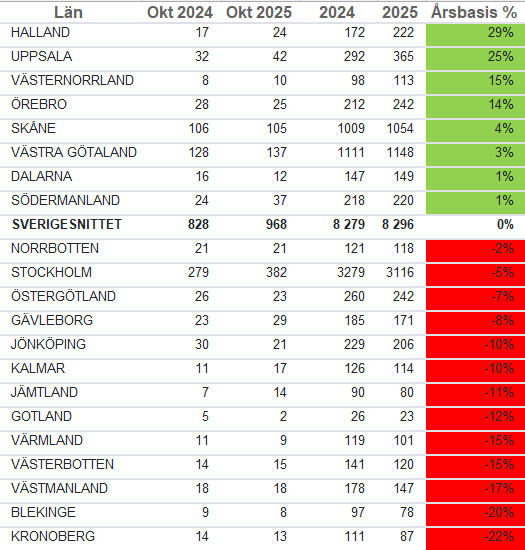 Bland de län som ökade mest märks Halland med 29 procent och Uppsala med 25 procent på årsbasis. De län som minskade mest är Kronoberg med 22 procent och Blekinge med 20 procent.