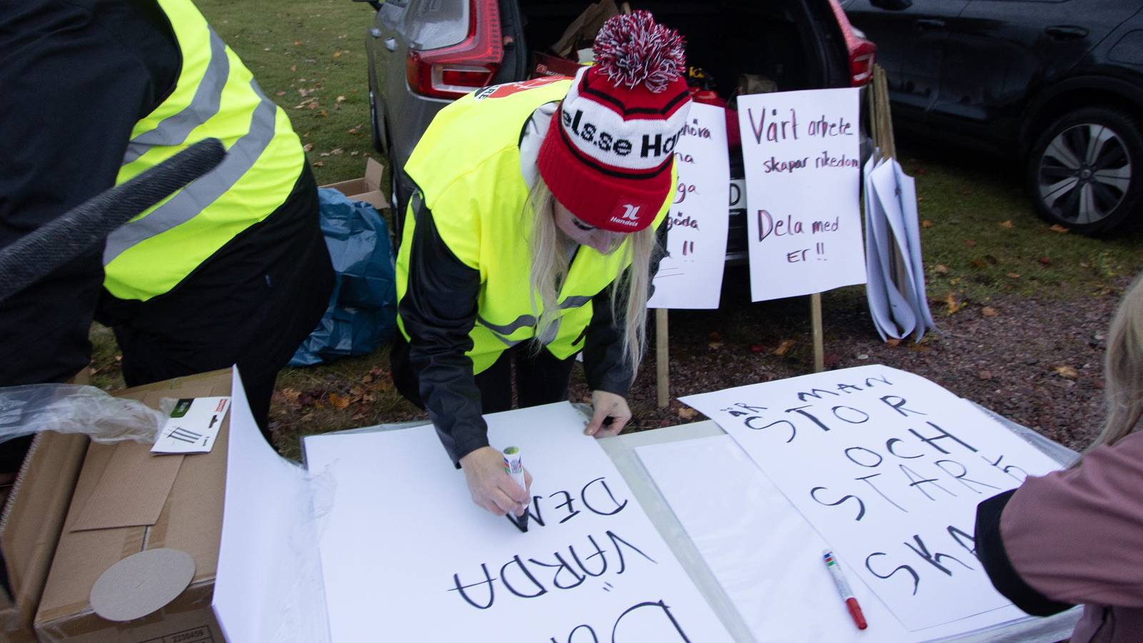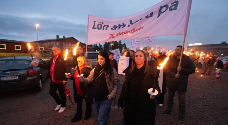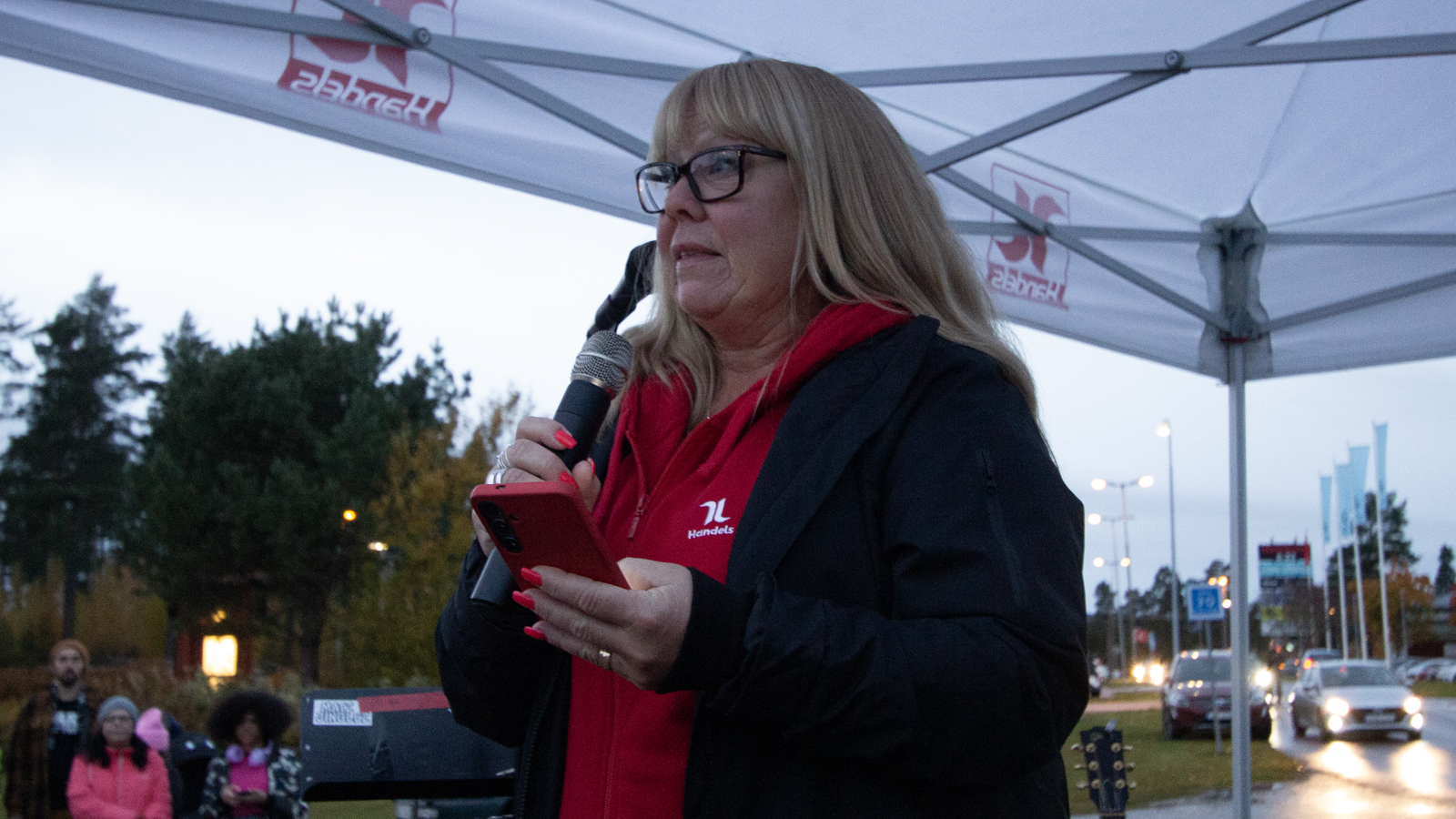— Det här handlar om respekt, trygghet och värdiga villkor på svensk arbetsmarknad. Det är sällan vi har den här sorten av konflikt. Att man dessutom bara lägger locket på och inte vill förhandla, är mycket dåligt. Det vanliga är annars att man förhandlar fram tills att man är överens. Målet nu är att få tillbaka dem till förhandlingsbordet, säger Linda Palmetzhofer, förbundsordförande, Handelsanställdas förbund som tagit sig upp till Insjön för att deltaga i manifestationen.