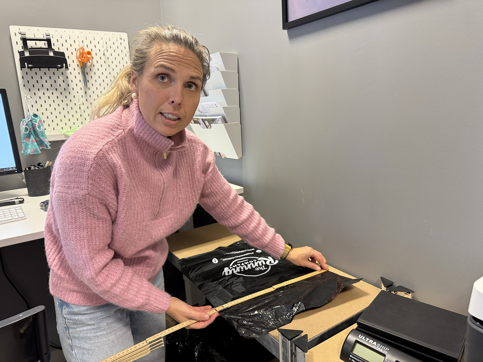 Petra plockar fram ett paket med ett par skor, stoppar det i en specialtillverkad påse.
