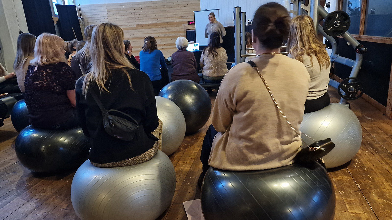 När det blev dags att sätta sig med sin smörgås och kaffekopp för att lyssna på Bellas presentation om sitt gym och ge hälsotips, var det muntra tillrop. Det fanns nämligen inga stolar. Istället hade man tagit fram gymbollar och stepbrädor att sitta på.
