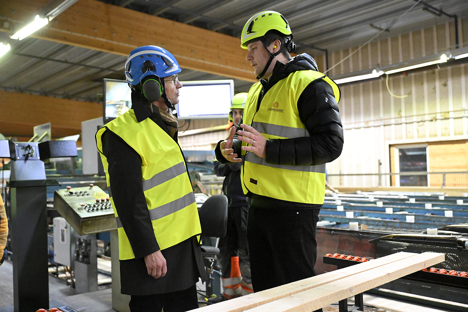 Hjälm och skyddsväst på och en snabb vandring genom det stora sågverket, där det var statsministerns nyfikenhet som gjorde att besöket kanske blev lite längre än planerat.