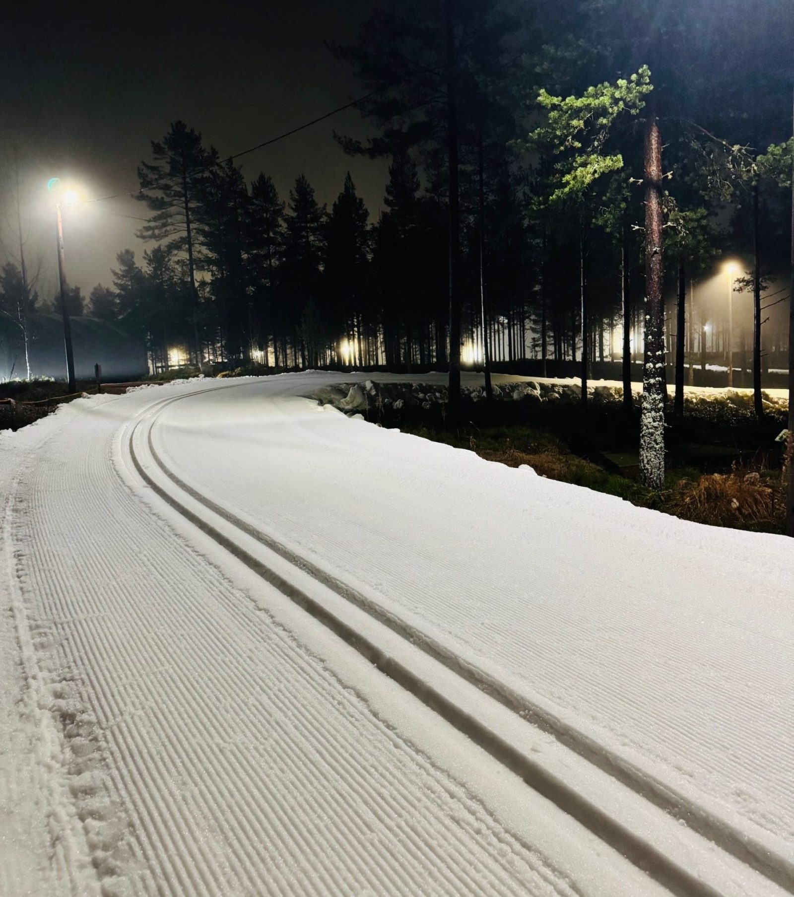 Tisdag morgon fanns det 1,5 km pistat spår och längre ska det bli.