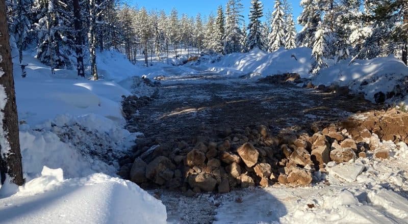Vägen går nära tjärnen och det är olika regler när det gäller om man ska bygga en skogsväg eller permanent väg, allra helst när vägen är så nära vatten som den aktuella vägen går.