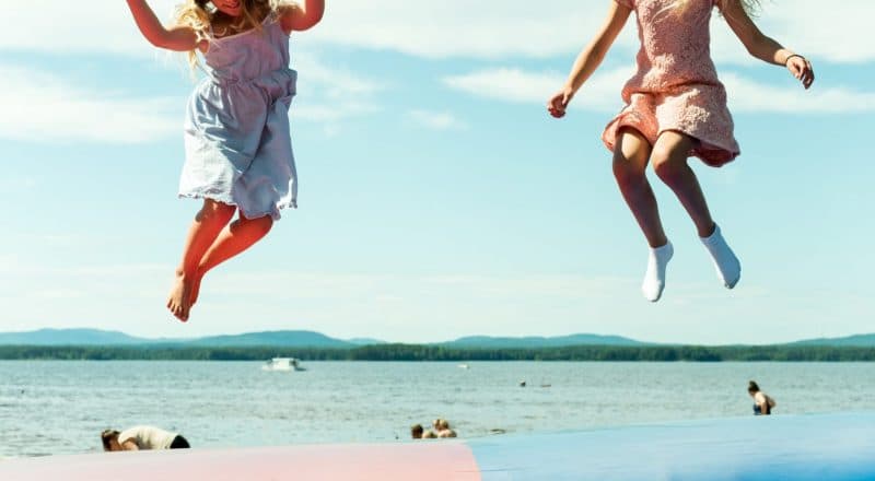 Bilden längst upp. Här ser vi de glada barnen, syskonen Olivia och Julia Ribby, studsa högt, men nu går det tyvärr inte att använda hoppkuddarna på ett tag. Foto. ORSA CAMPING