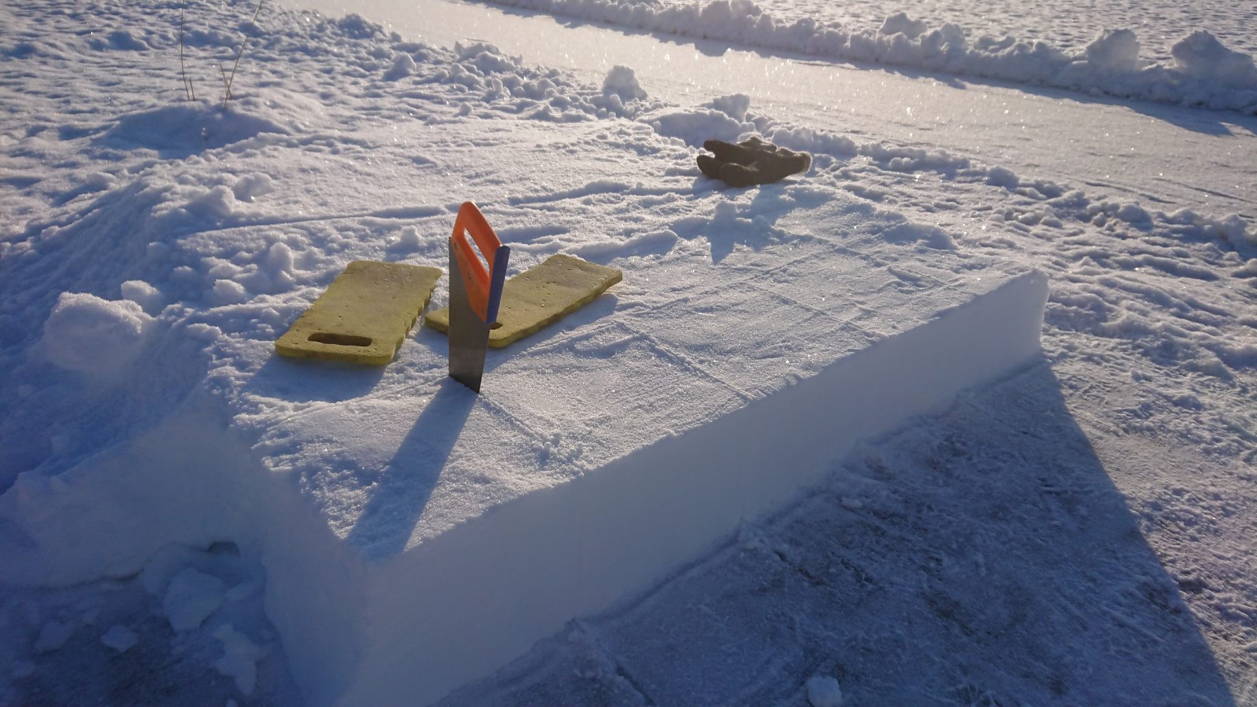 — När den första snön la sig på isen, så var det kanske bara fem centimeter. Då körde jag med snörakan och skottade ihop till en bädd som jag sedan packade med snöskorna.
