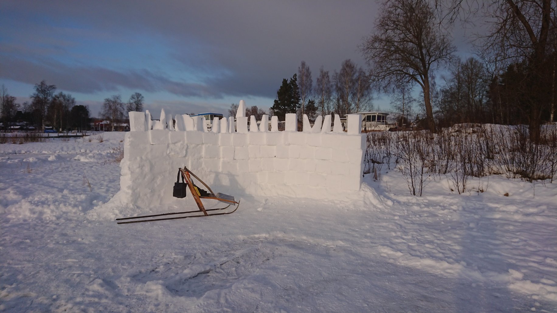 När han nästa dag skulle sätta sig och mysa vid sin snöborg såg Helge att någon roat sig med att köra sönder bygget med en skoter. Det var en ledsen Helge vi pratade med den gången.