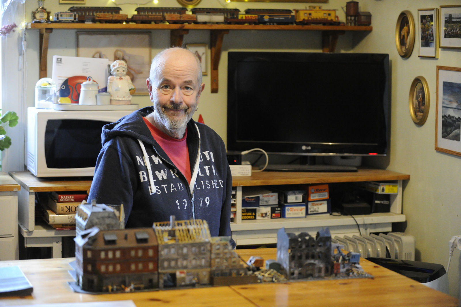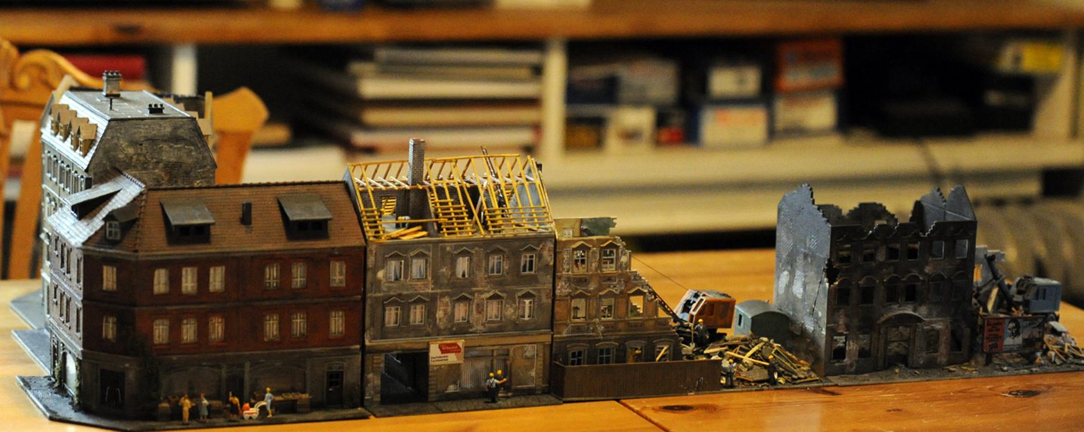 — Det är Hamburg. Att hålla på med diorama, som det heter, är bra träning för mina fingrar. Jag ska beställa fler delar och när det är färdigt är den 2×1 meter stor. Får jag tag i grejer, så hoppas jag bli klar till sommaren.