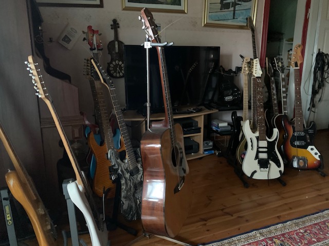 Han visar oss upp på övervåningen. Förutom en massa fina tavlor pryds övervåningen av ett stort antal gitarrer.
