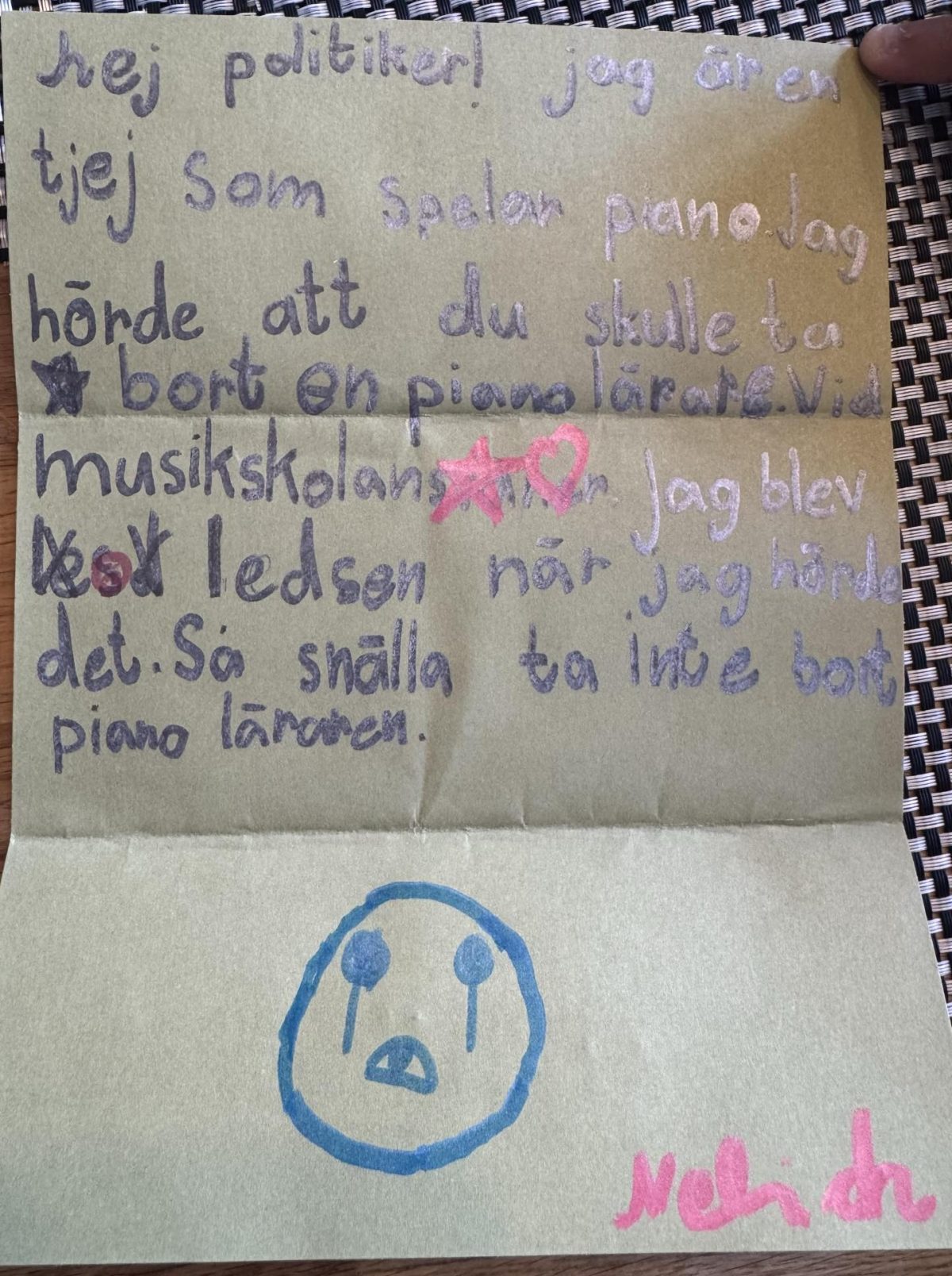 Anne berättar vidare att 9-åriga dottern Neliah skrivit ett kort brev till politikerna. Vi har fått tillåtelse att publicera brevet. Neliah poängterar att hon blev ledsen och skriver bland annat: ”Så snälla, ta inte bort pianoläraren”, vädjar Neliah till Orsas styrande.