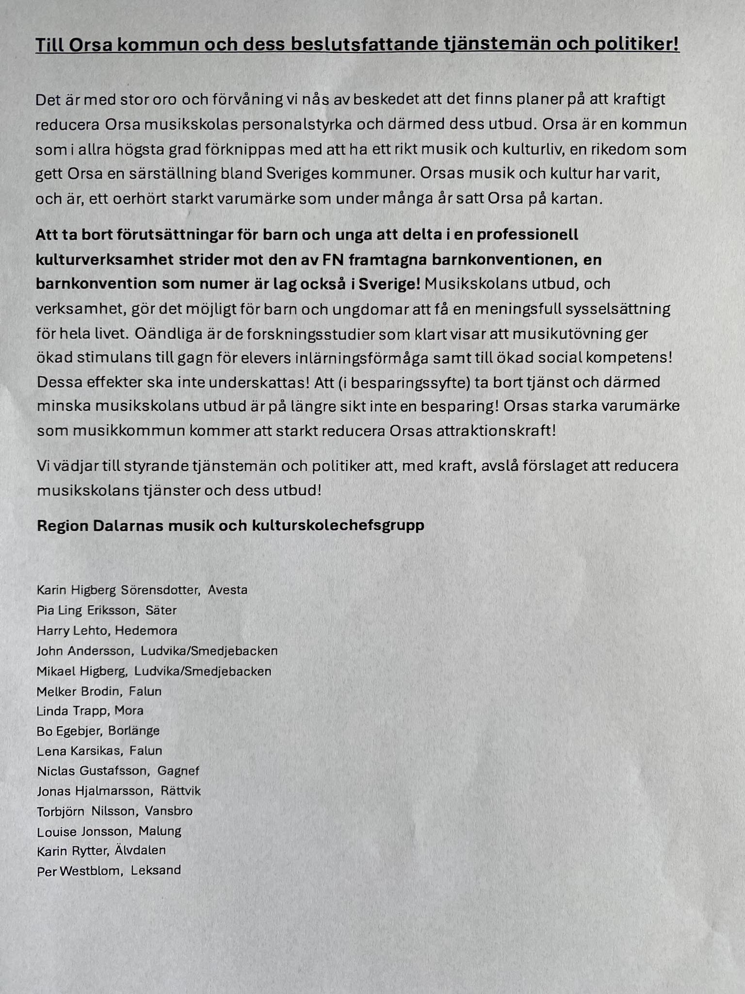 Förslaget att ta bort en tjänst från Orsa Musikskola berör inte bara Orsa. Region Dalarnas musik och kulturskolechefsgrupp, med representanter från hela Dalarna, vädjar till Orsas politiker att ”med kraft avslå förslaget att reducera musikskolans tjänster och dess utbud.”