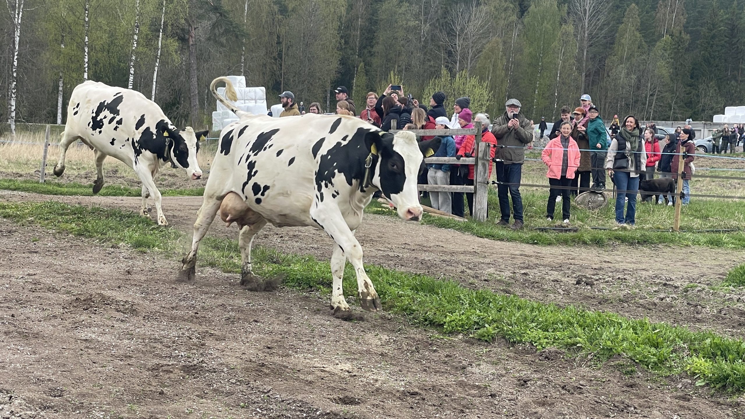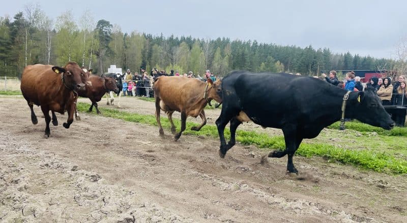 Redan innan kosläppet råmades det ljudligt inifrån ladugården, som om korna visste vad som väntade. ”De laddar upp” sa en liten pojke som verkade exalterad över att få se utspringet. Klockan 11 var det dags – ut ur ladugården rusade 63 kor i olika tempo med sikte på det frodiga gräset till åskådarnas stora förtjusning.