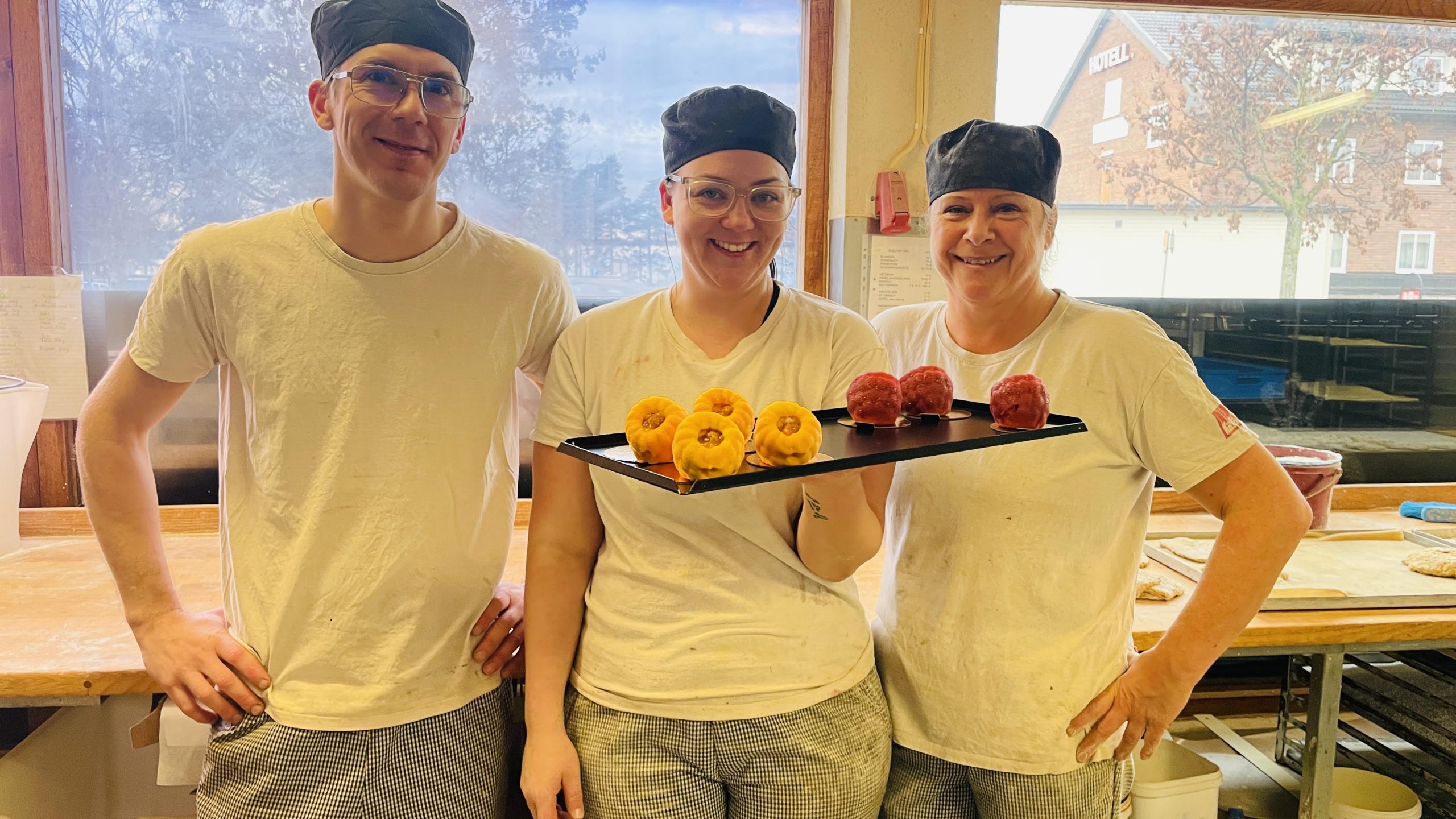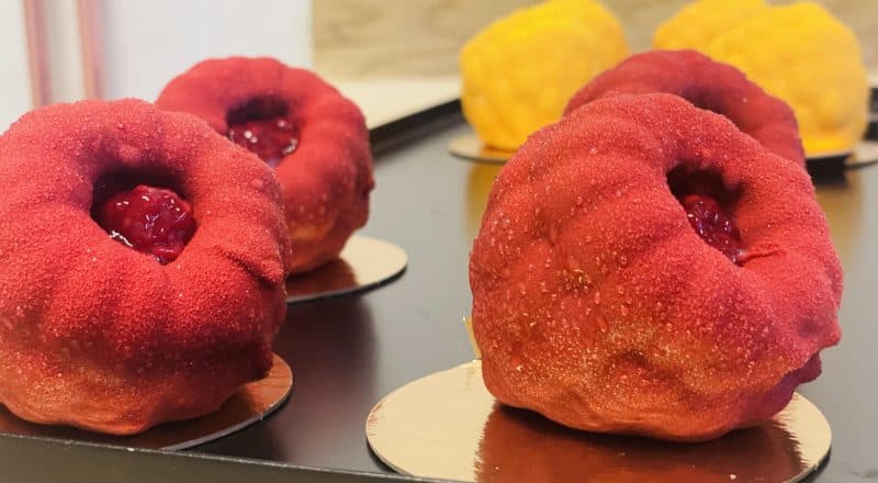 Nu har de lyckats få hem ett gäng hallonformar som Sofie tillsammans med kollegan Christoffer Johansson har använt för att ta fram två olika fruktbakelser med egna kompositioner.