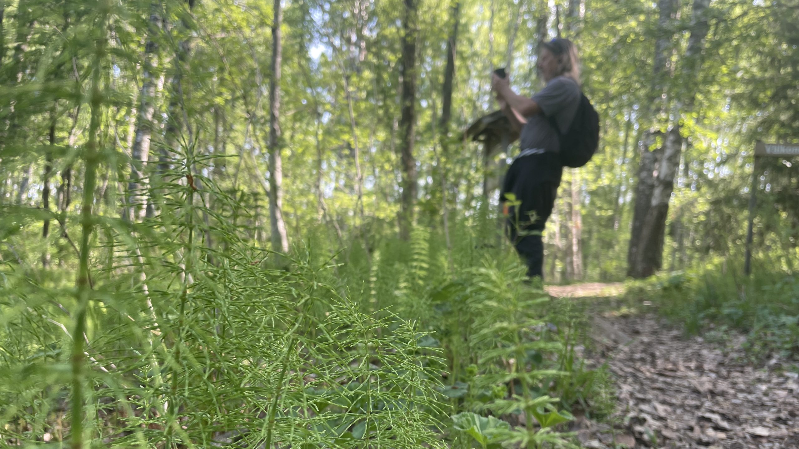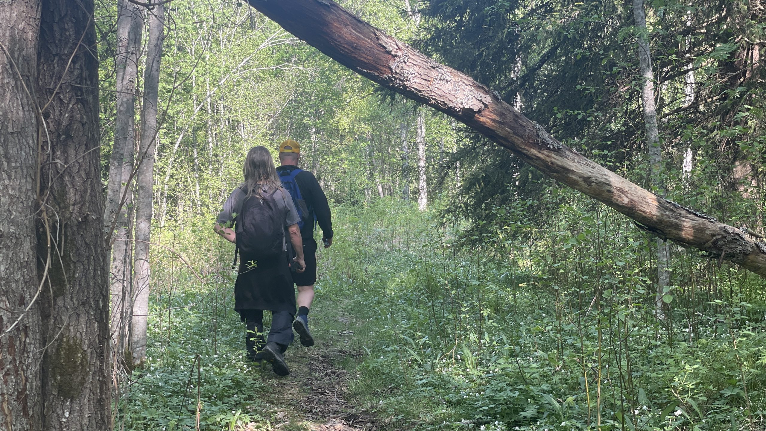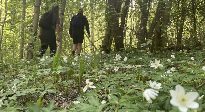 Det är förmiddag och solstrålarna silas mellan lövverken. Vi vandrar genom vildhallonbuskar och andra växter som ingen kan namnet på. I dag är planen att gå till en liten tjärn för att njuta av lite kaffe och macka berättar Niklas som förutom ett par bra skor även ser till att fylla ryggsäcken med fika.