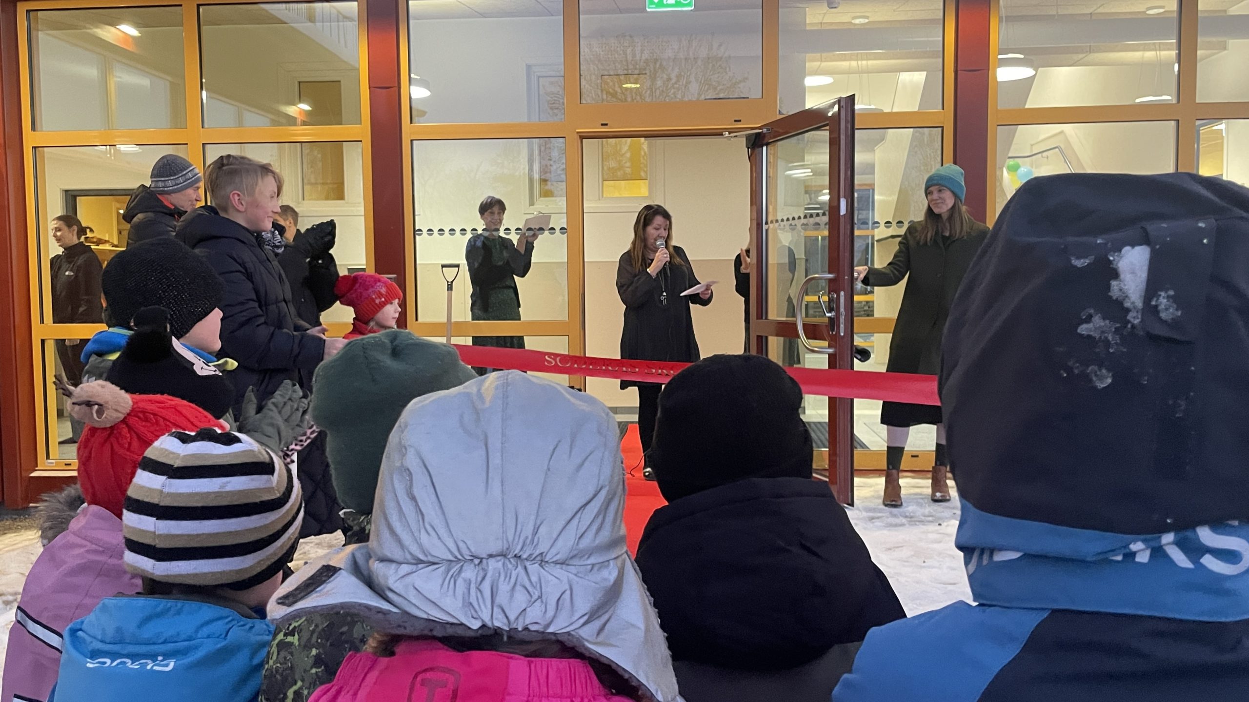 Det blev en annorlunda start på terminen efter julledigheten för de drygt 100 eleverna som går på skolan. Vid halv nio på morgonen stod alla utanför den nya entrén med en spänd förväntan över att se tillbyggnaden som de inte haft tillträde till förrän i dag. När så bandet var klippt öppnades dörren upp och alla fick gå in på röda mattan till levande musik som Musikskolans lärare stod för.