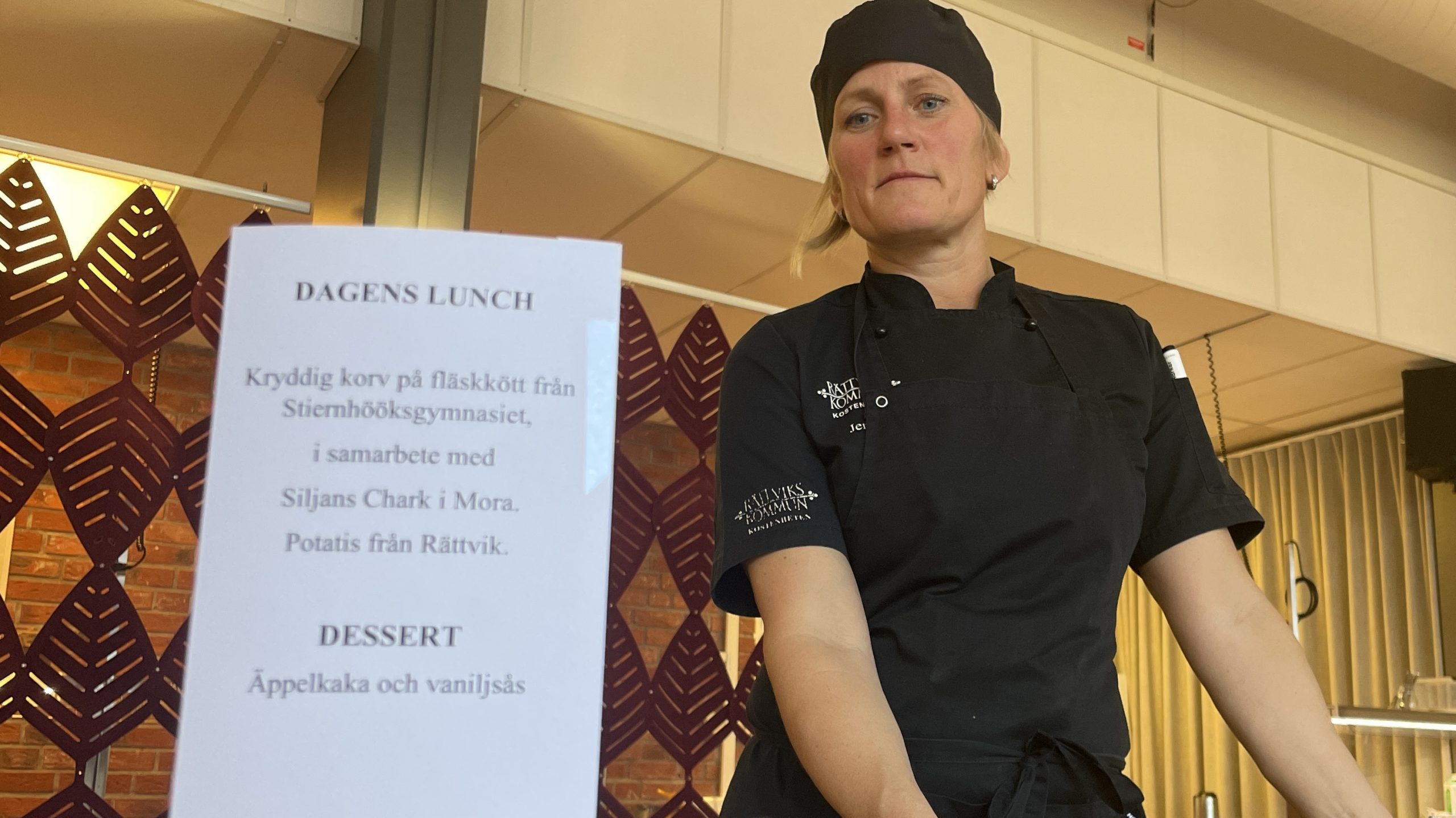 — Vi har valt att servera en korv som är gjord på skoljordbrukets kött och det är Siljans chark som har hjälpt oss att producera den här korven, så har vi vår egen potatis och lokala grönsaker och så är det en efterrätt, säger Nina Prosén som är verksamhetsutvecklare inom kostenheten.