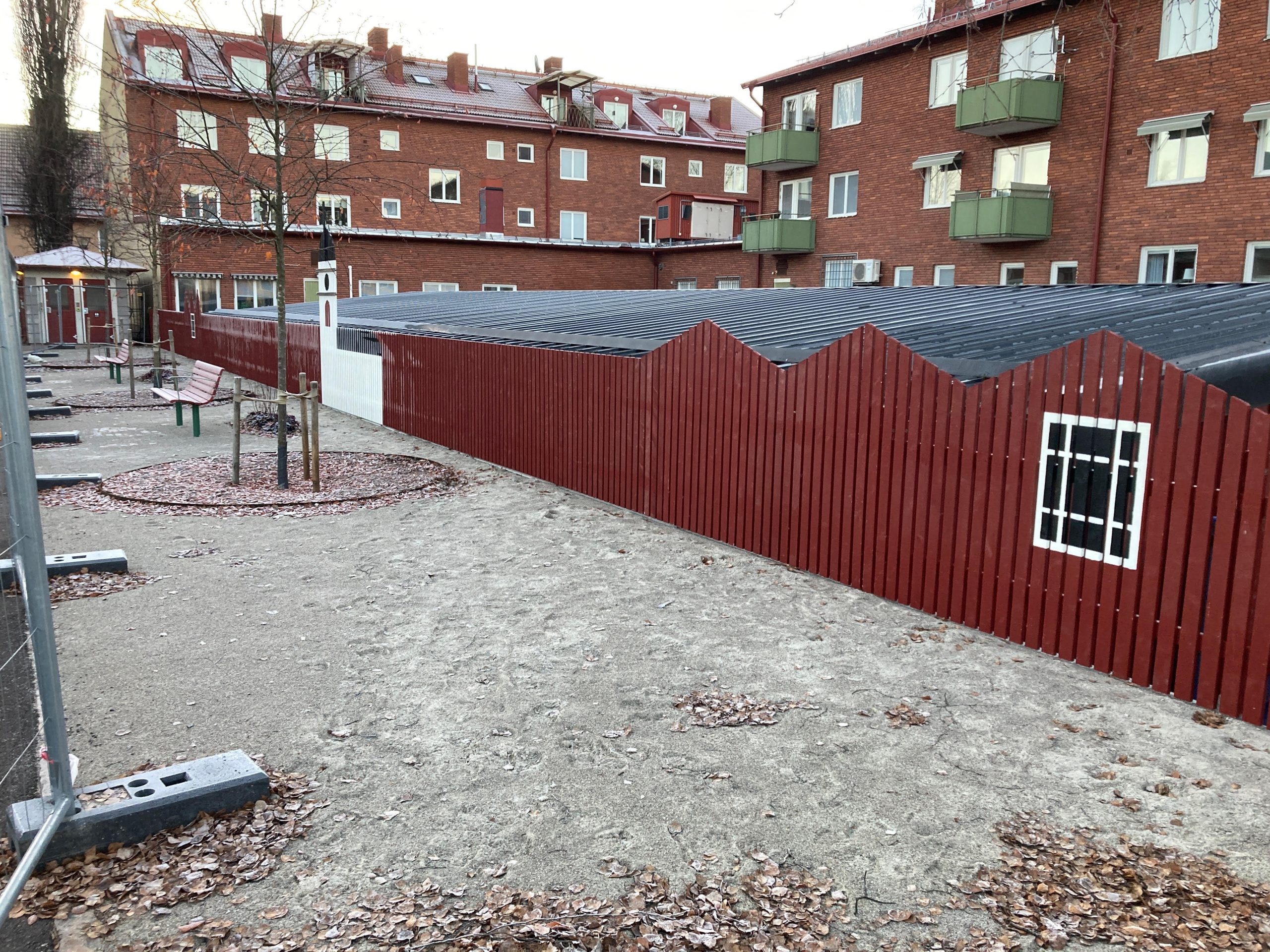 — Det var viktigt att det inte bara blev ett långt rött staket utan att det skulle hända något efter vägen, så då tog vi kyrkan som en siluett och sedan lite röda hustak på två ställen. Vi är jättenöjda, det blev över förväntan, säger Anna Lindbom, kommunarkitekt som tillsammans planarkitekten Sandra Håmås tagit fram ritningarna för området.