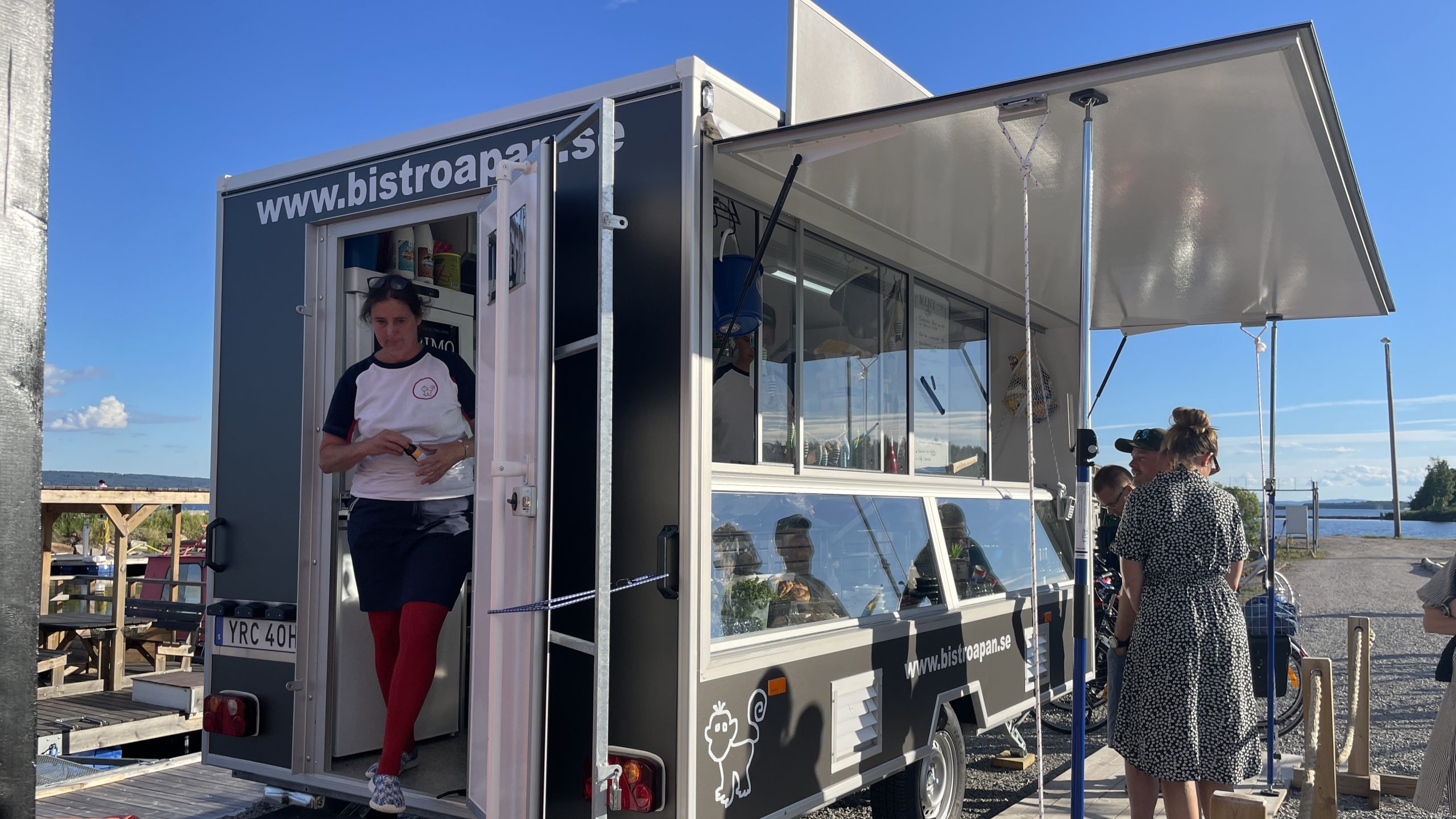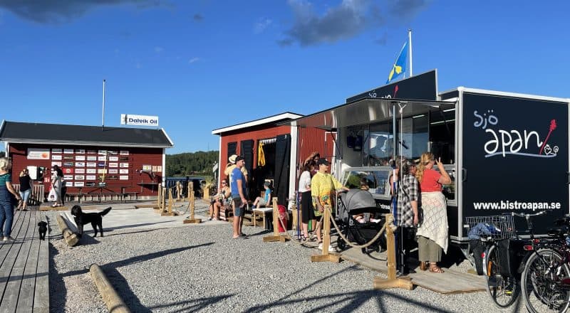 Här nere finns runt 70 sittplatser utomhus på kajen och inne i paviljongen får det plats runt 15 stycken. För Jeanette och Michael väntar nu en hektisk sommar tillsammans med personalen. Här nere i hamnen kommer man som sagt att hålla öppet alla dagar i veckan och uppe i byn håller Bistro Apan öppet tre dagar.