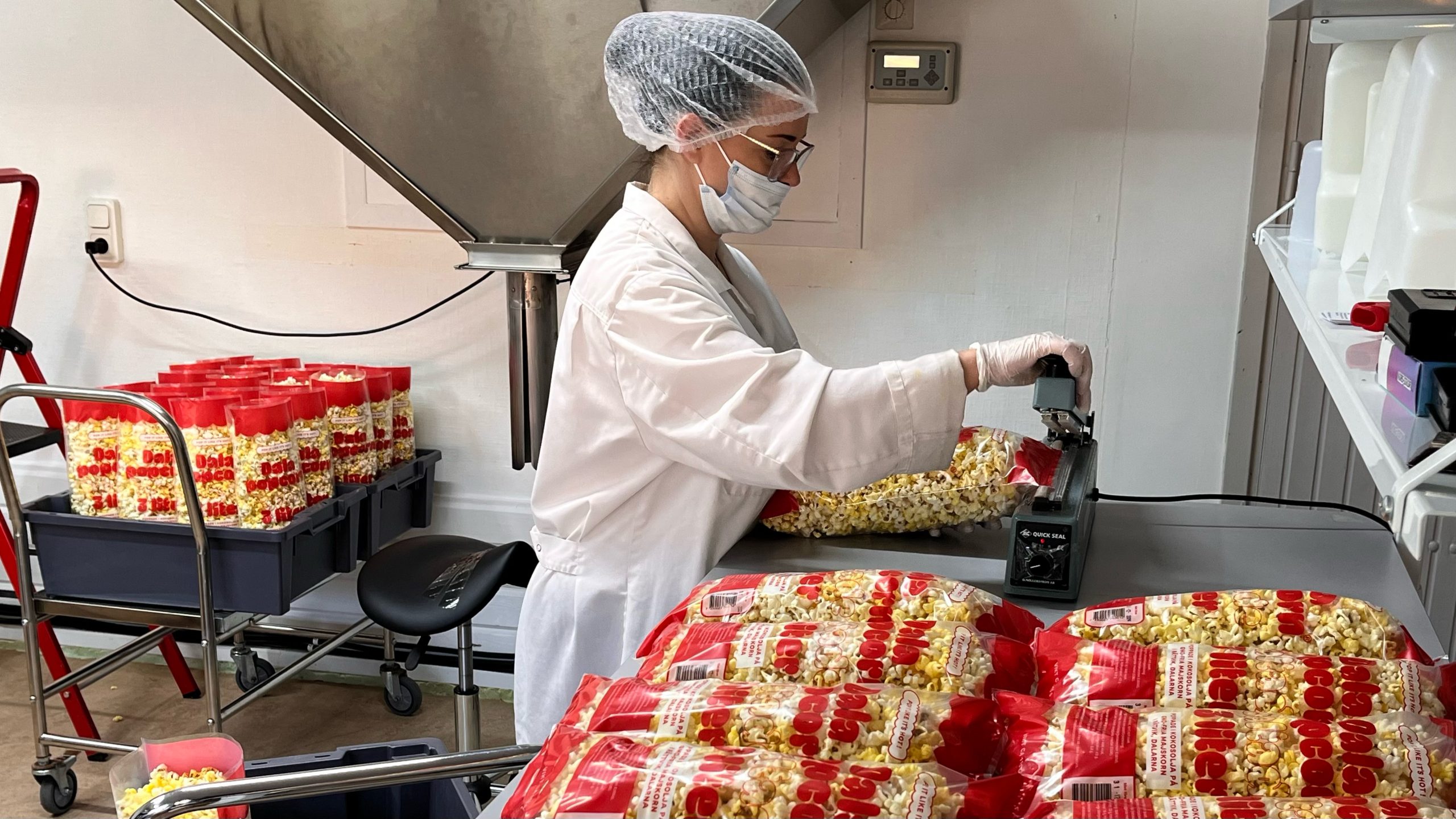 Helena skopar de färdiga popcornen som väller ut och vidare ner på ett bläck med hål i så att alla kärnor och popcorn som inte håller måttet sållas ut. De stora kartongerna som ska ut till biografer fylls på och sedan är det dags att plocka treliterspåsarna. Under en sådan här tillverkningsdag blir det lilla lokalen fylld av både doft och kartonger.