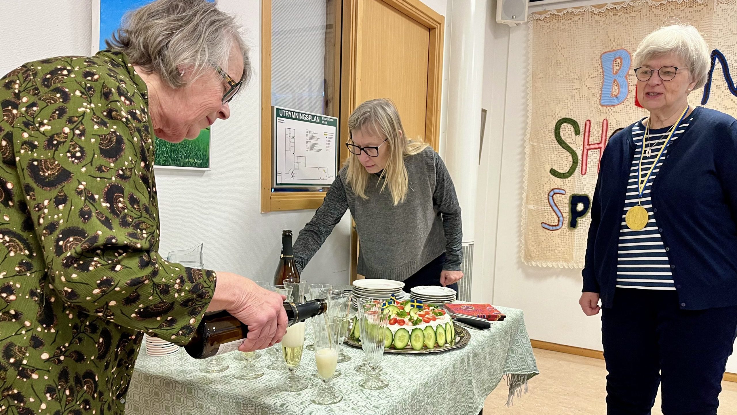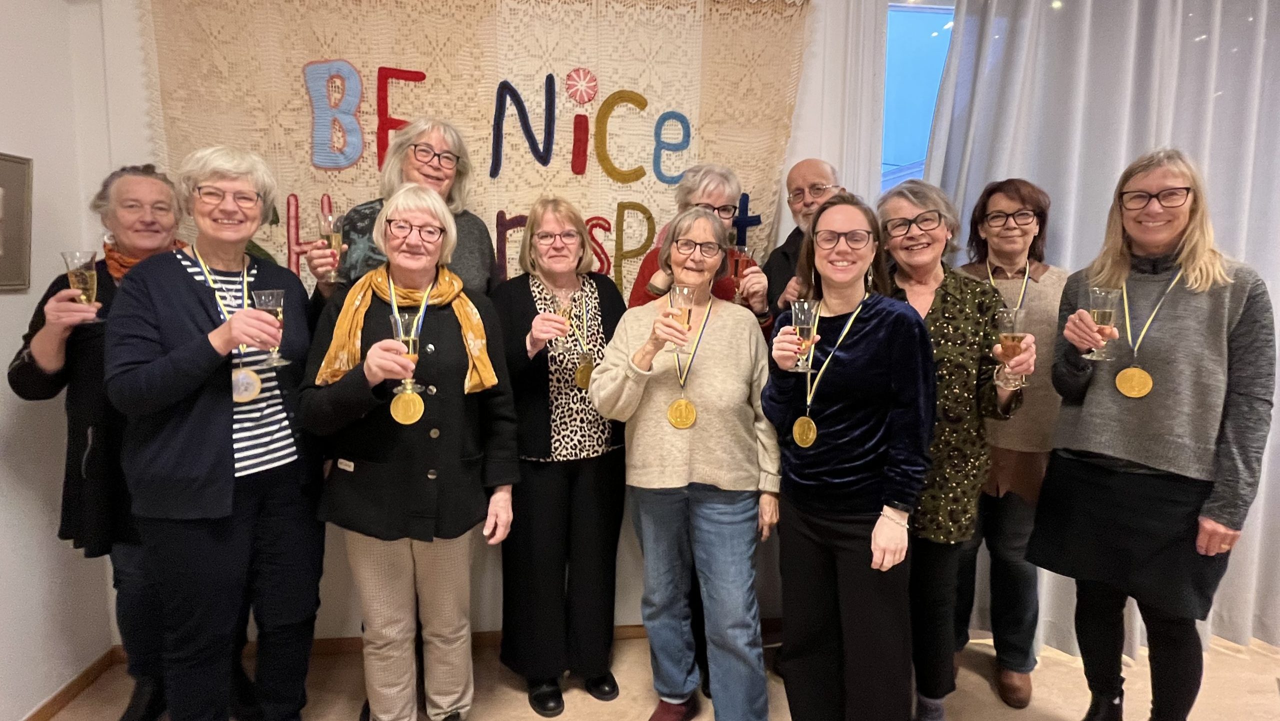 Under december har kommunens sagoläsare inom projektet Allas Barnbarn firat tillsammans. När terminens sista möte samlade gänget bjöds det på smörgåstårta och bubbel – och på varm uppskattning. Samordnaren Lis Forslund, som i år tilldelades kommunens Kulturpris, passade på att hylla hela gruppen och den viktiga verksamheten genom att dela ut chokladmedaljer till samtliga sagoläsare. Självklart fick också Lis ta emot hyllningar och blommor från det läsande gänget och kommunens samordnare från bibliotek- och förskoleverksamheten.