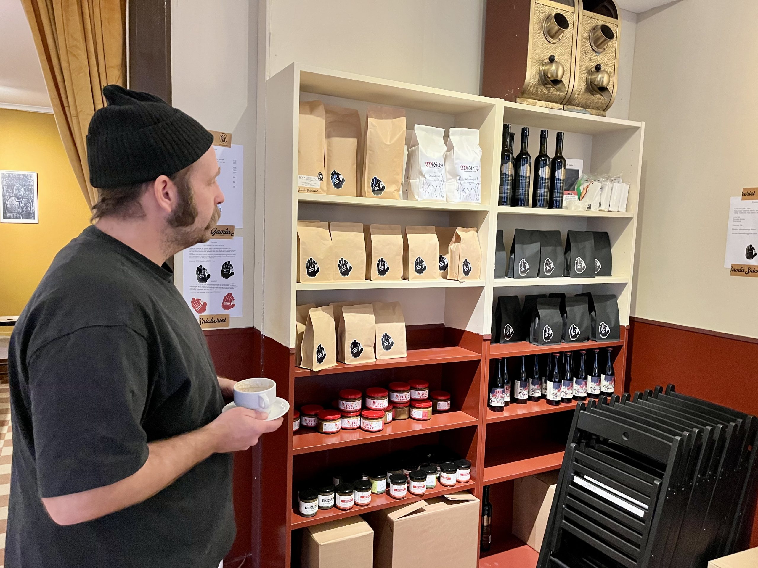 Det märks att Joachim trivs. Det rustika uttrycket från Gamla Snickeriet har fått följa med och det gamla rutiga golvet från järnaffären har plockats fram igen. Det har gett både högre takhöjd och mer karaktär. Väggarna i ockragult och jazzmusiken i bakgrunden skapar en varm och välkomnande stämning med en aning storstadskänsla. Kanske är det inte så märkligt, med tanke på att Joachim tidigare drivit kaffebar i Stockholm. Men flytten till Säter ångrar han inte för en sekund.