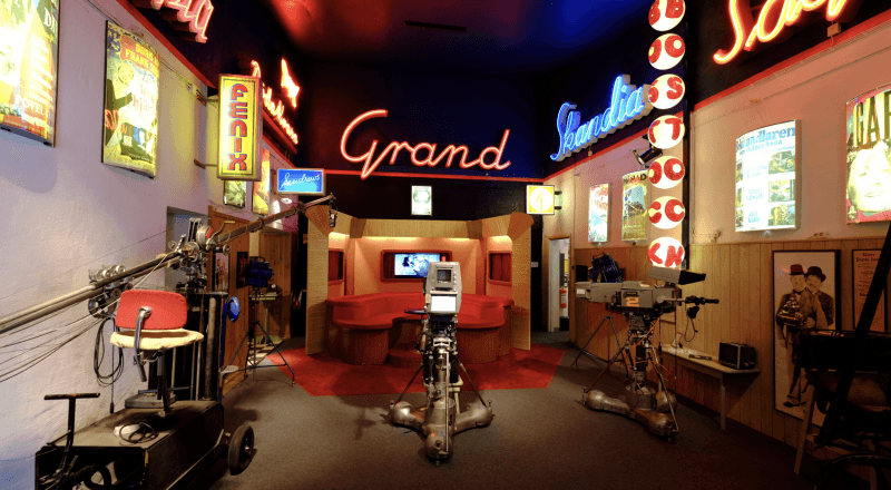 Museet består av flera uppbyggda miljöer som tillsammans berättar den rörliga bildens historia – från 1950-talets svartvita 17-tums tv till dagens fredagsmys framför skärmar som täcker stora delar av vardagsrumsväggen. Den smakfullt inredda museibiografen utgör hjärtat i utställningen, men här finns också filmkameror, projektorer, tv-apparater och Sveriges första OB-buss – inrymd i ett särskilt garage.