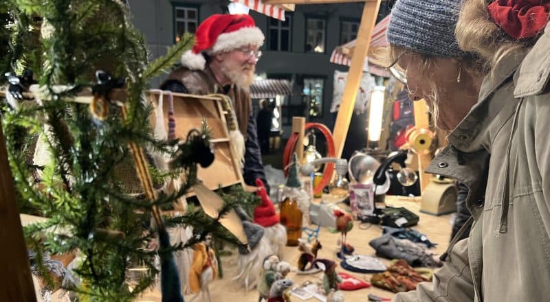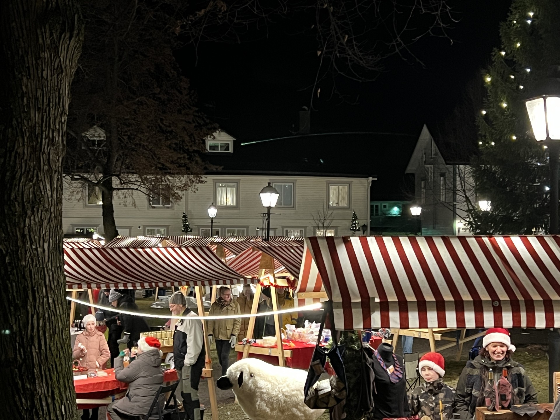 På Rådhustorget väntar en marknad fylld av genuint hantverk, hembakat och vackra juldetaljer. Här samsas cirka 40 utställare med föreningar, skolklasser och unga entreprenörer. Tomtemor delar ut klappar till barnen, ardennerhästen Rejäl drar sin vagn mellan de pyntade kvarteren, och överallt sprakar det av musik och glada tillrop.