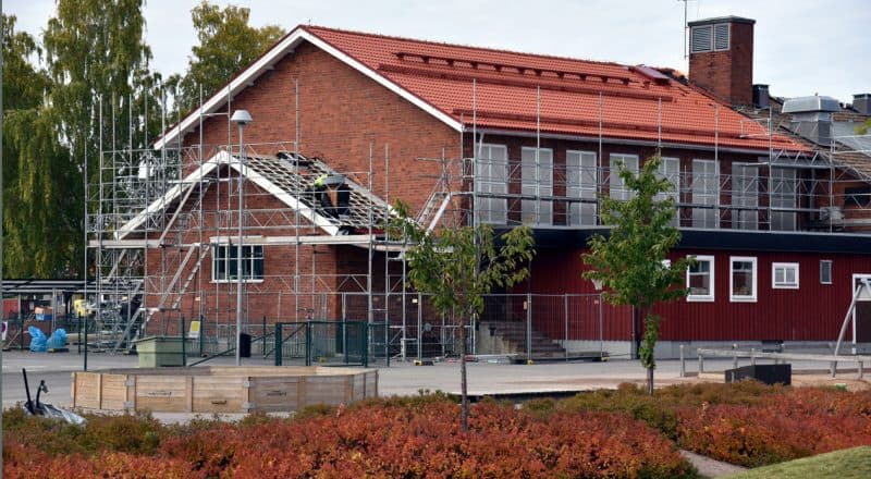 Röda tegelpannor på gamla skol delen lyser i kapp med sina färg matchande dito på nya skol delens tak. 2018 stod nya delen av Skedvi skola klar. Nu är snart takomläggningen på gamla delen klar.