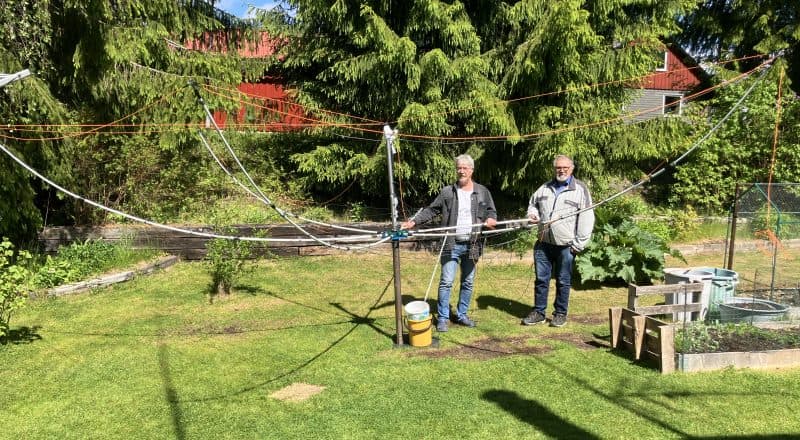 Göran Adeborn och Börje Andersson står på Görans gård och känner lite på en väldig antenn som är under konstruktion och snart ska fästas på villataket i Morgårdshammar.