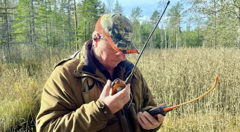 Ingemar Hällström justerar komradion och sökaren han fick i 60-årspresent. Där kan han följa hundarna i realtid och ligga steget före de andra i laget.