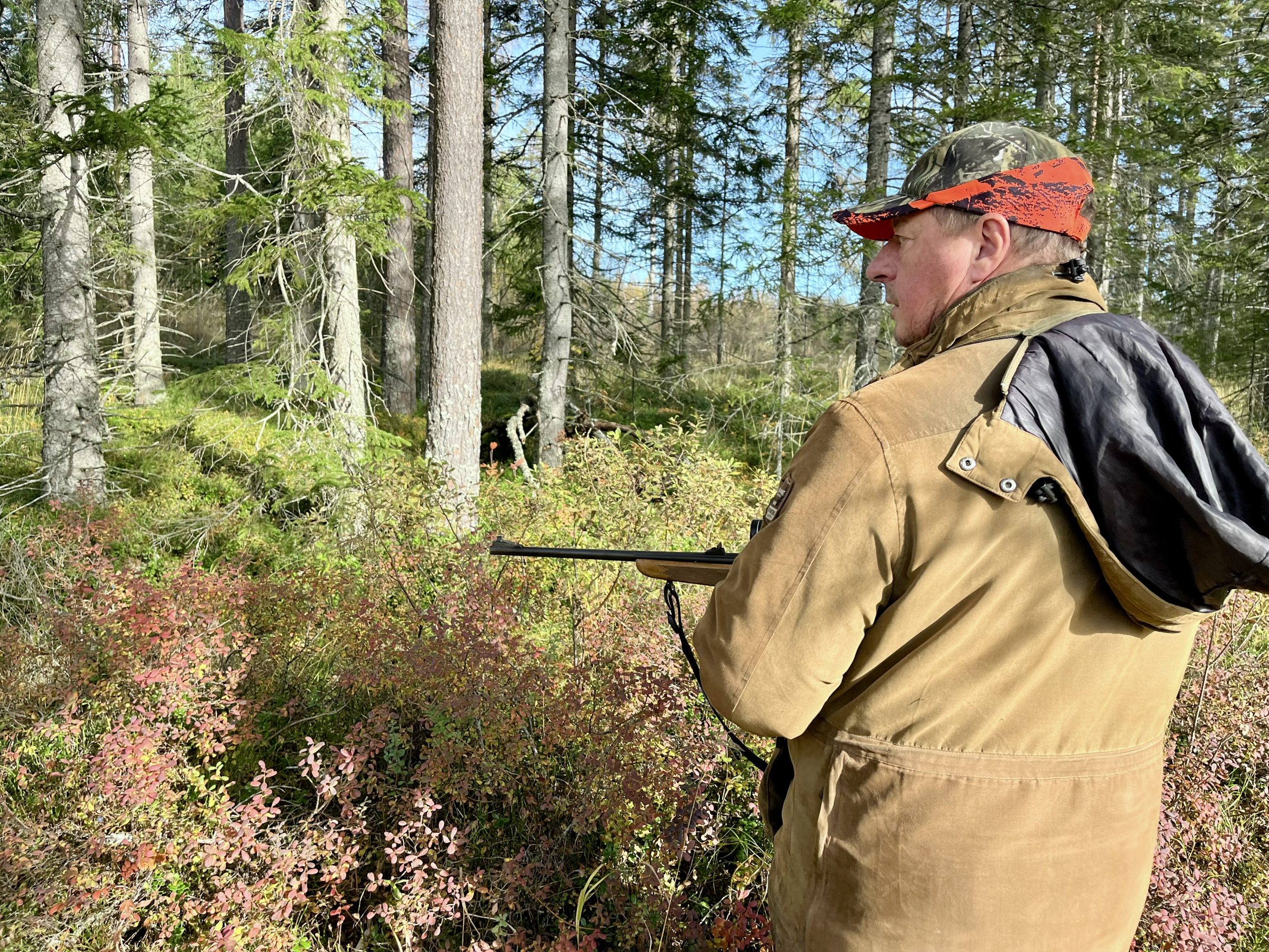 Den här fredagen är han en del av jaktlaget Hällsjön Norra – nio personer utplacerade i skogen med målet att fälla en kalv och en tjur. Kalven har de redan hittat, men tjuren låter vänta på sig.