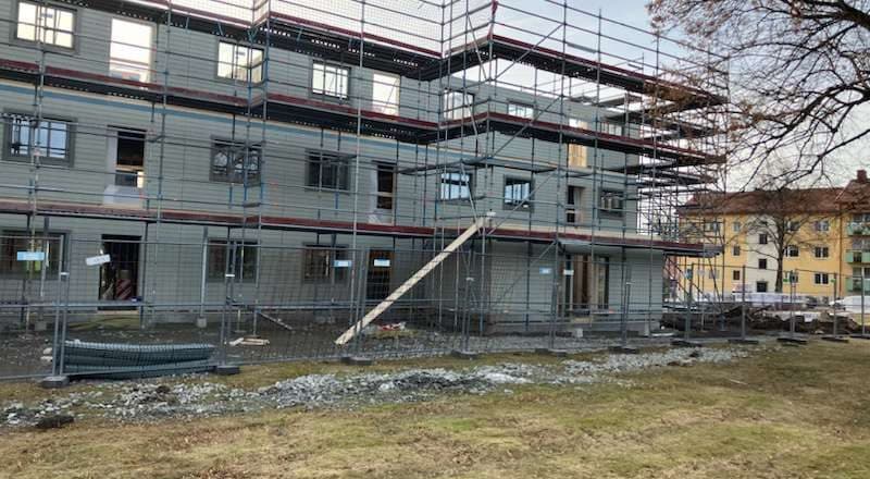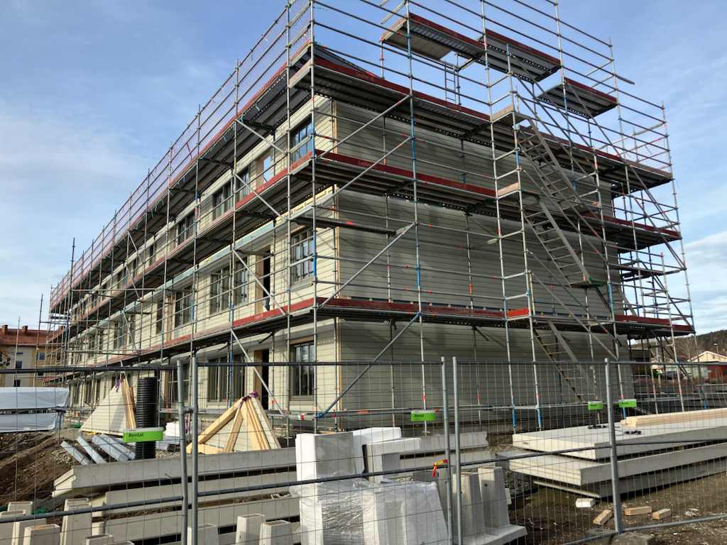 Men nu har faktiskt de kommande nya bostäderna börjat resa sig på riktigt, på ängen mellan de andra husen i Smedjebacken.