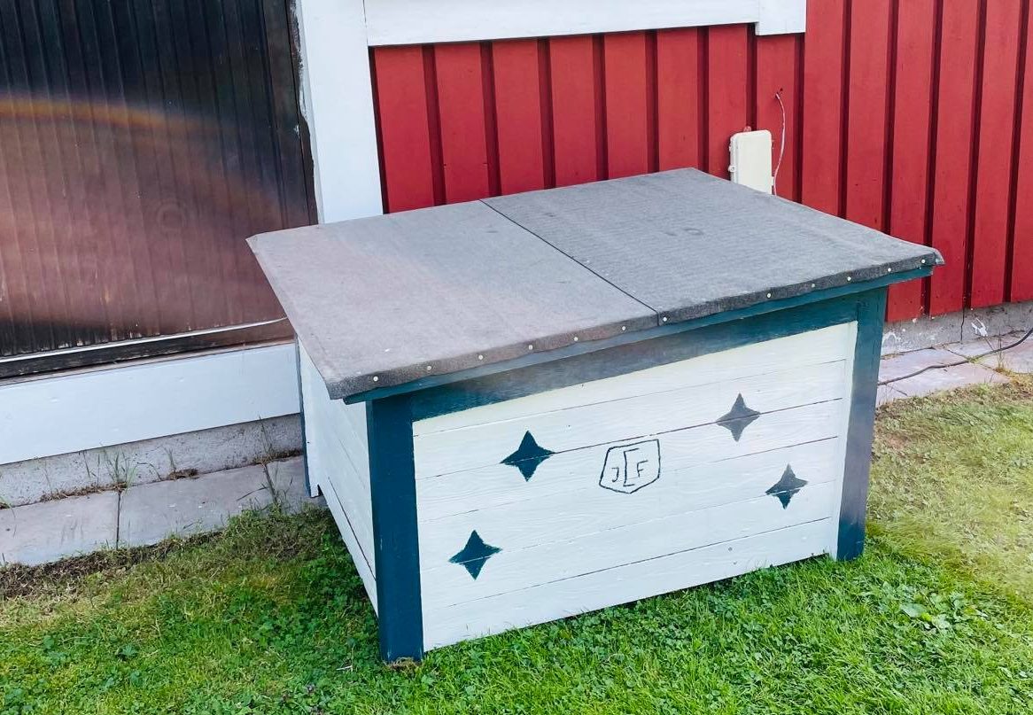 Det är som ett garage till robotgräsklipparen och det ”garaget” är målat i Leksands IF:s färger med stjärnor på.